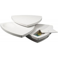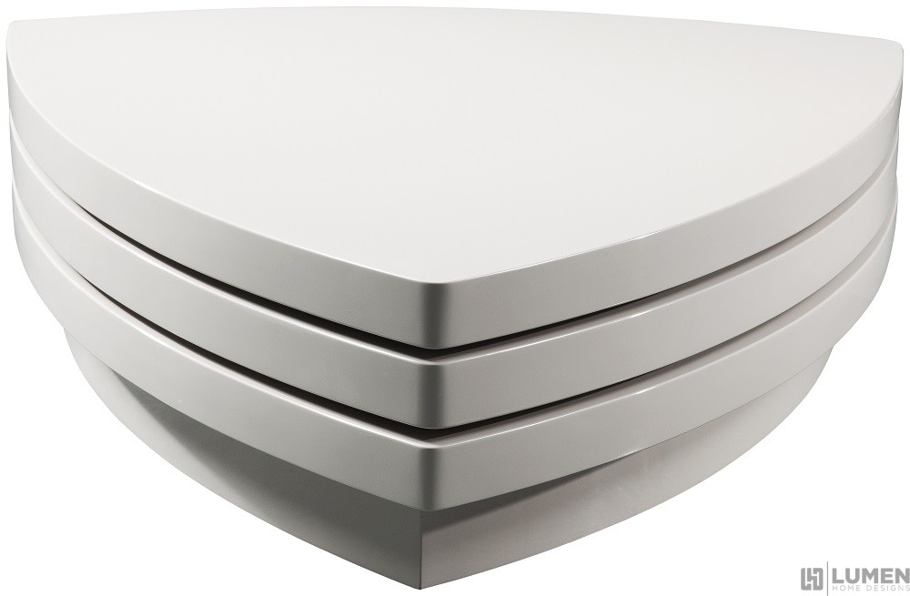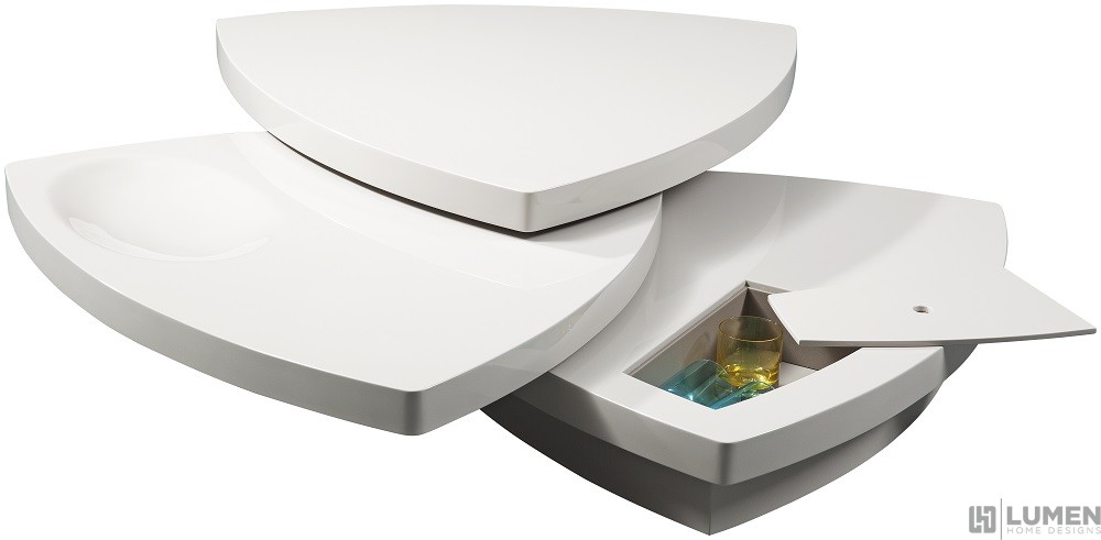 Short Description Make your home more fun and fabulous with a transformable Coffee Table that can sport various different looks. This three-tiered shield-shaped center table in high gloss taupe finish has two main sections that can be completely rotated according to your design preference. The bottom layer, on the other hand, has a secret compartment for storing various items. Futuristic and visually stunning.