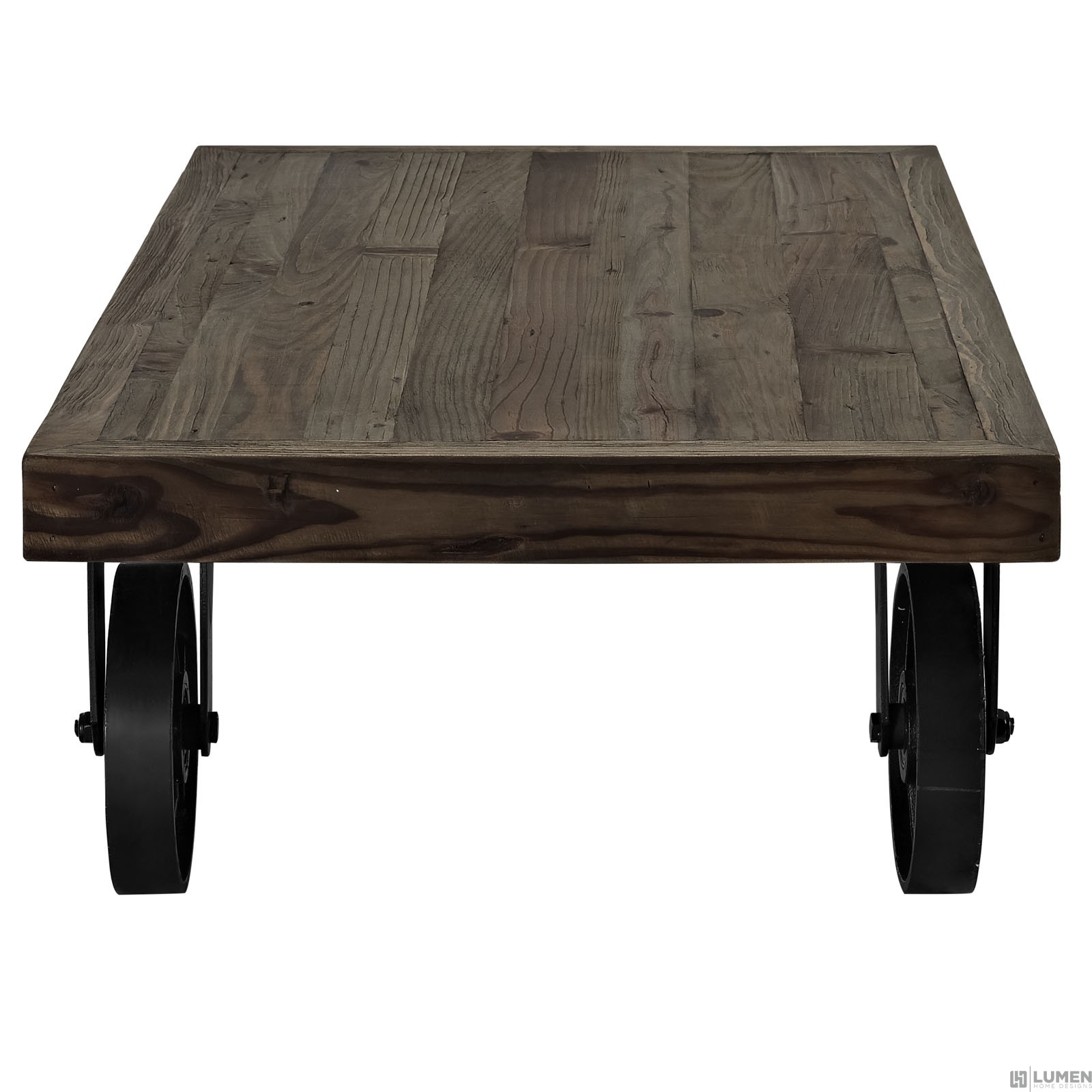 Short Description Industrial modern coffee table Solid pine wood top (stained but not sealed) Four metal wheel base