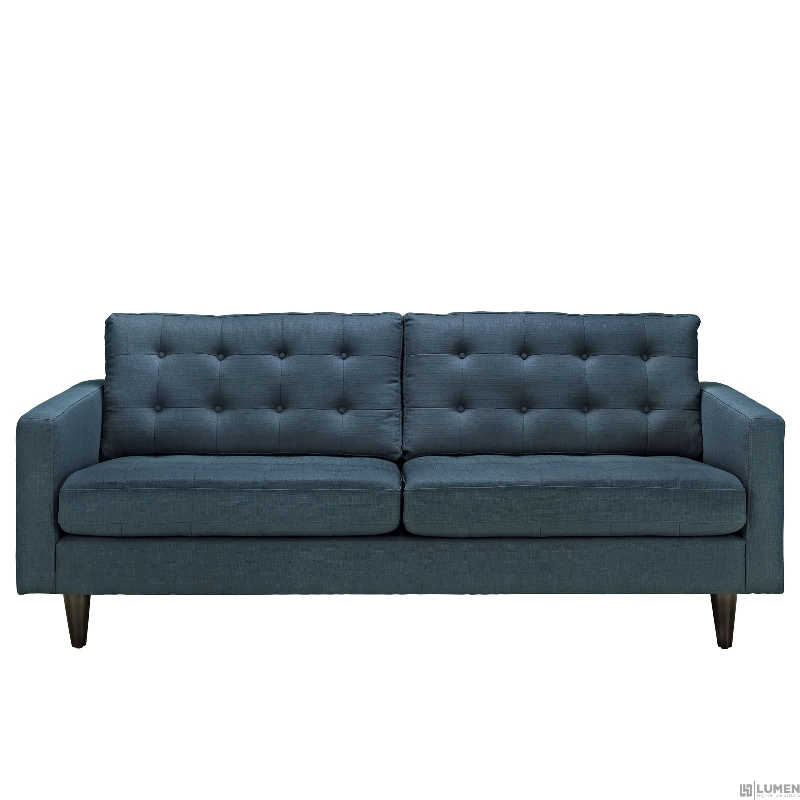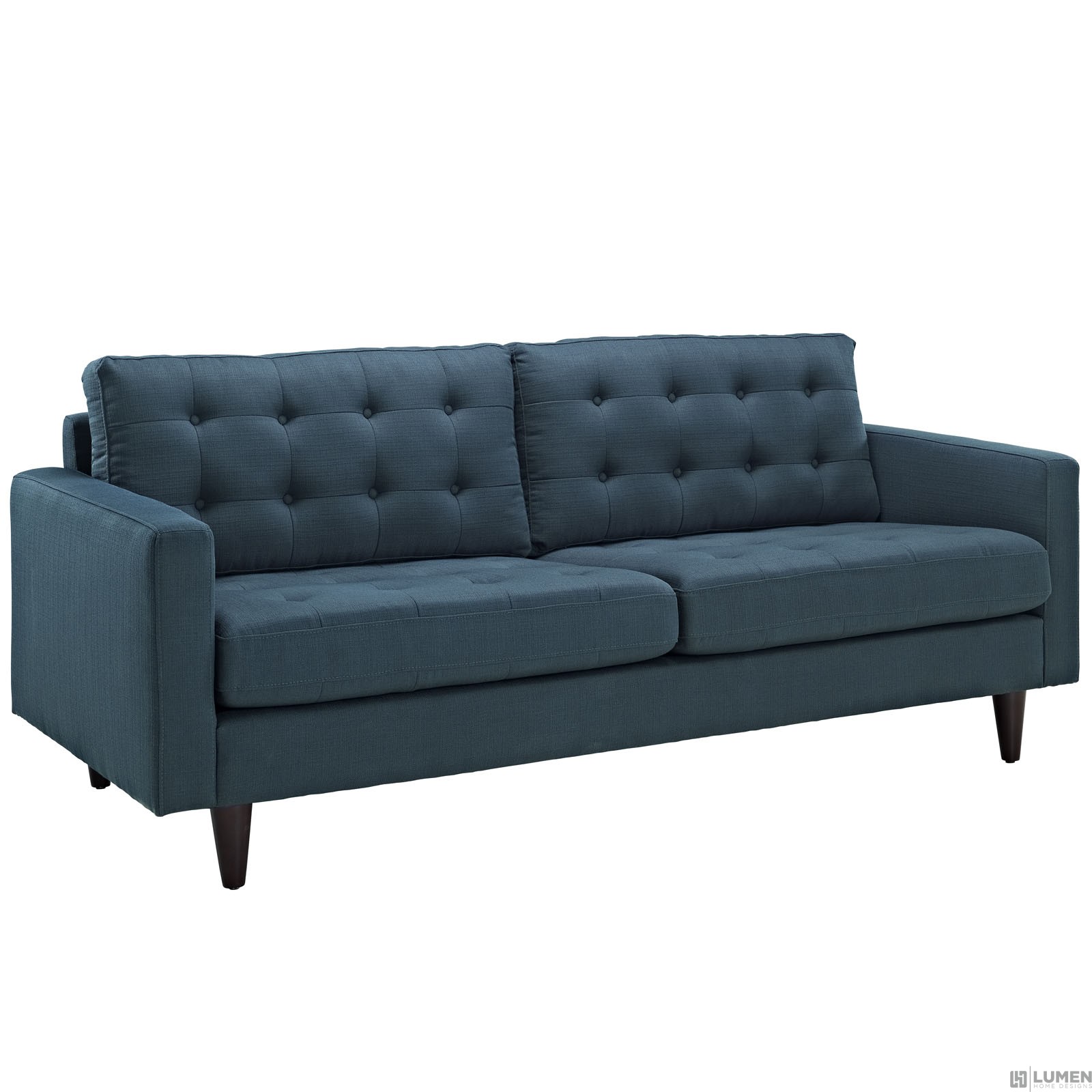 Short Description Modern Sofa Deeply tufted buttons Polyester upholstery Solid wooden legs Glides to prevent scratching Weight capacity 660 lbs.
