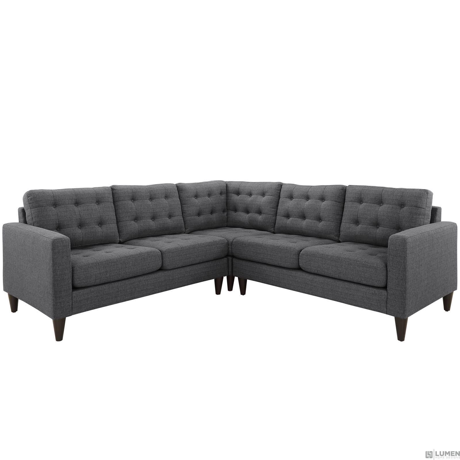 Short Description Two loveseats and corner sectional Deeply tufted buttons Fine polyester upholstery Solid rubberwood legs Glides to prevent floor scratching