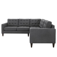 Two loveseats and corner sectional Deeply tufted buttons Fine polyester upholstery Solid rubberwood legs Glides to prevent floor scratching