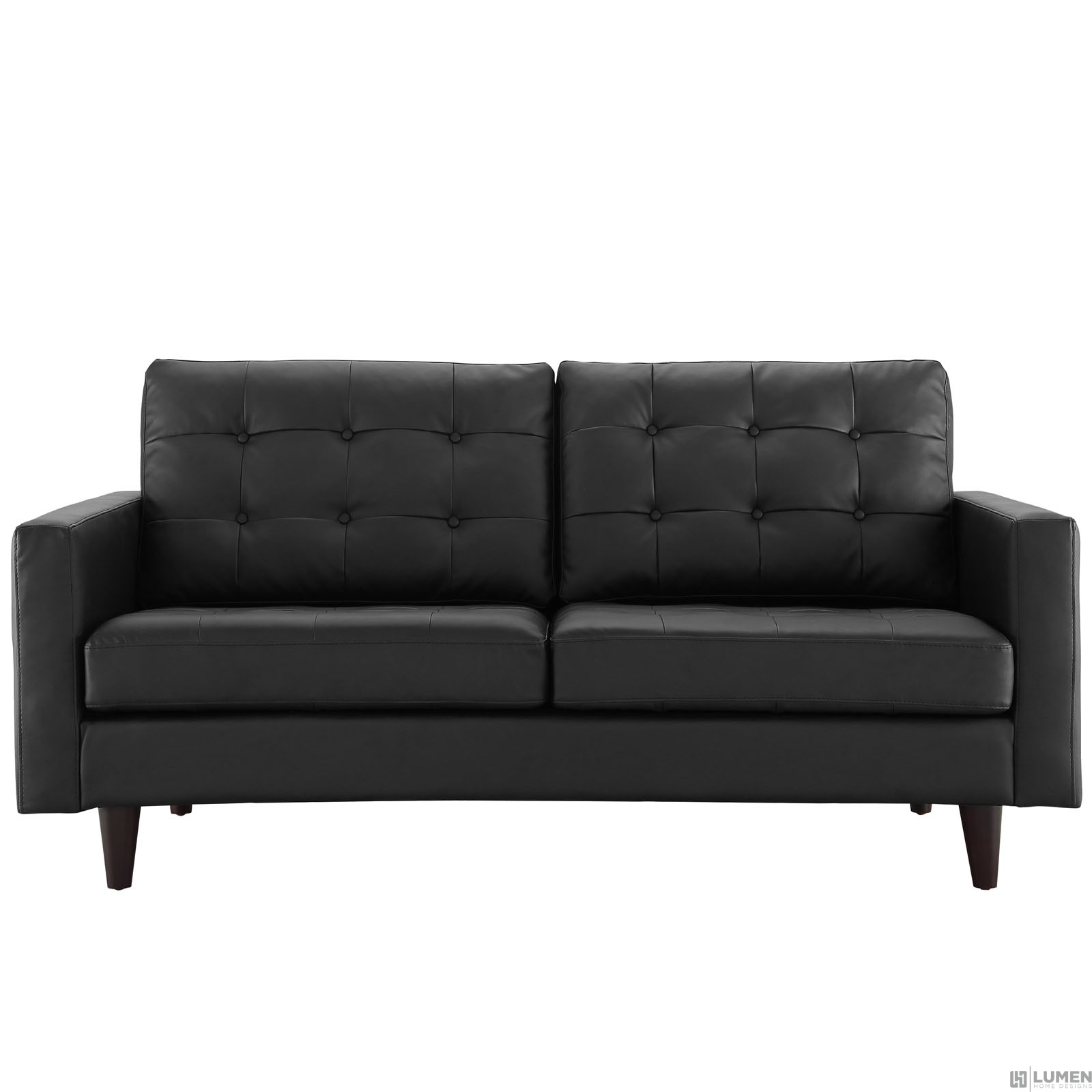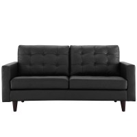 Short Description Mid-century modern style loveseat Deeply tufted buttons Finely upholstered in leather Plastic foot glides Solid rubberwood legs Wipe clean surface Some assembly required