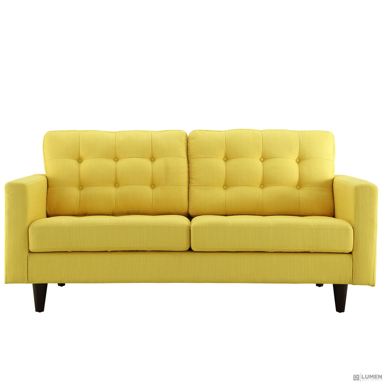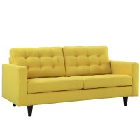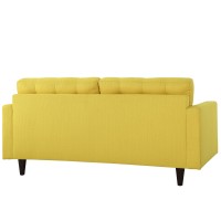 Modern loveseat Deeply tufted buttons Fine polyester upholstery Plastic foot glides Solid rubberwood legs Spot clean only Some assembly required