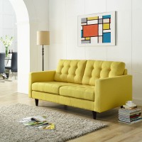 Short Description Modern loveseat Deeply tufted buttons Fine polyester upholstery Plastic foot glides Solid rubberwood legs Spot clean only Some assembly required