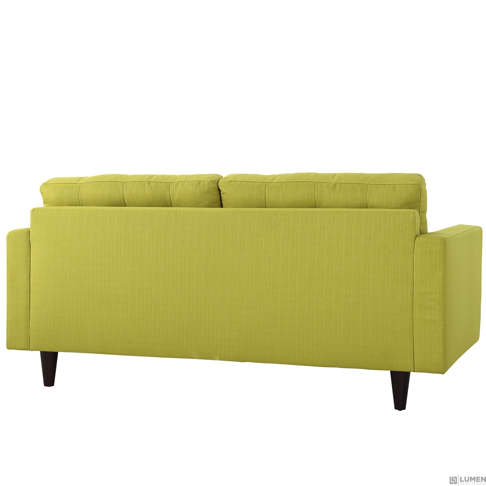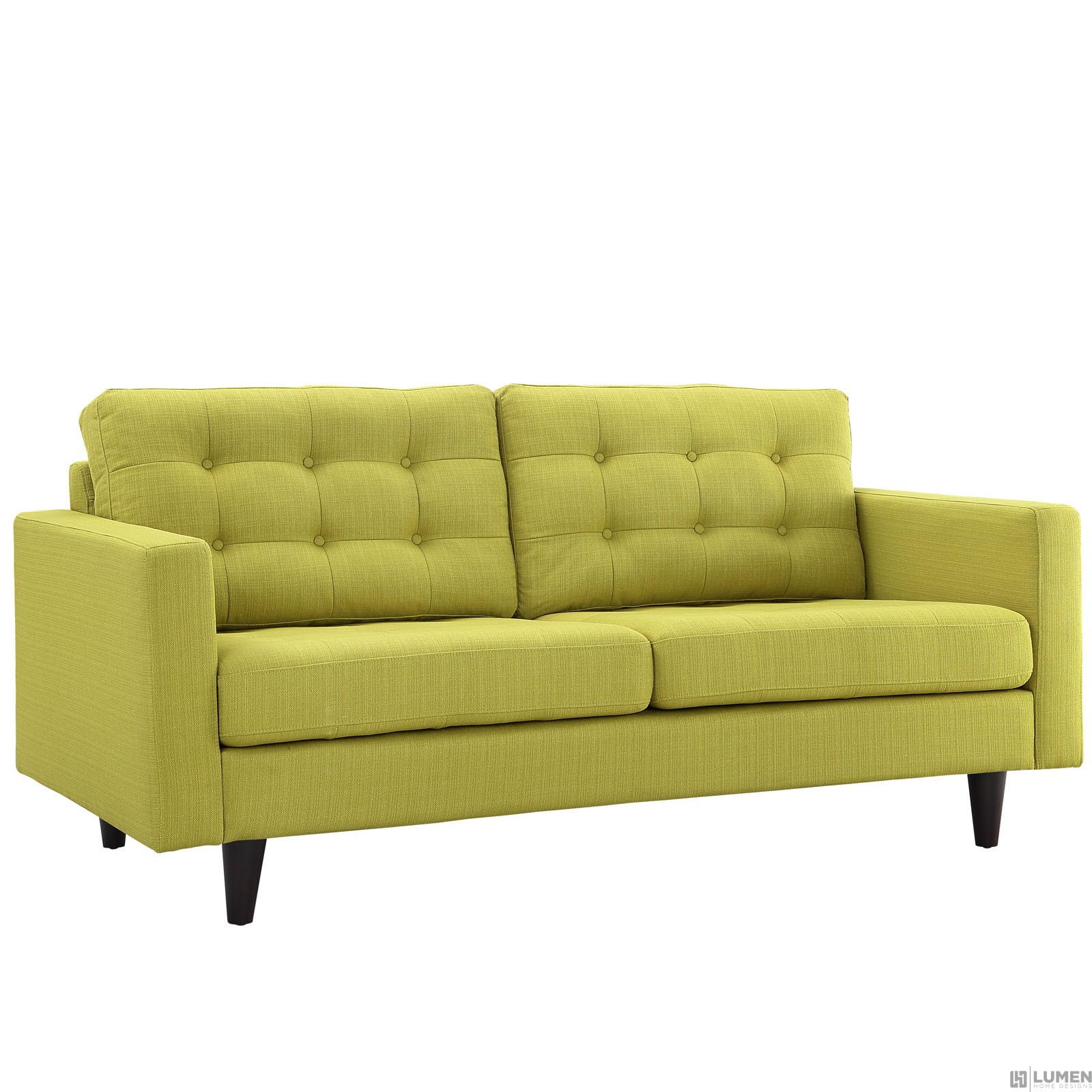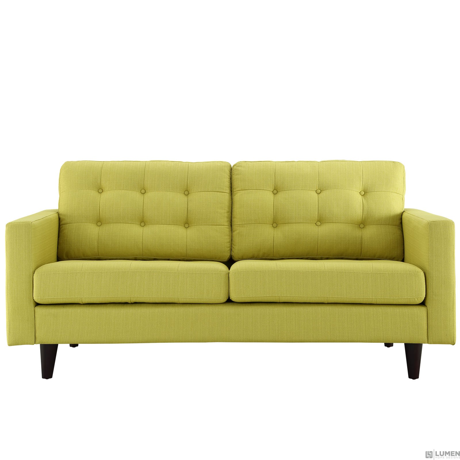 Short Description Modern loveseat Deeply tufted buttons Fine polyester upholstery Plastic foot glides Solid rubberwood legs Spot clean only Some assembly required