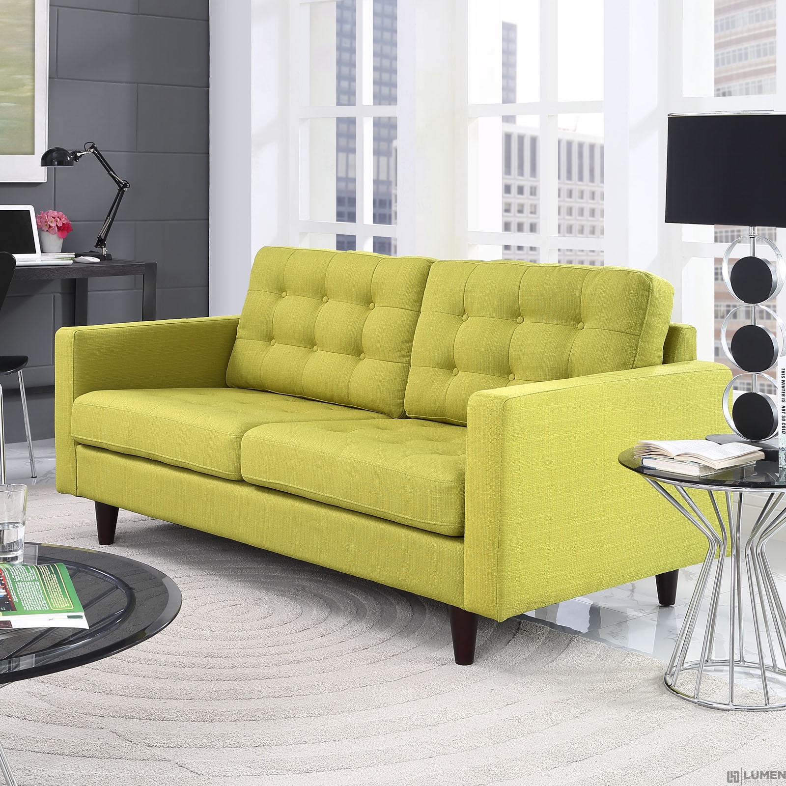 Modern loveseat Deeply tufted buttons Fine polyester upholstery Plastic foot glides Solid rubberwood legs Spot clean only Some assembly required