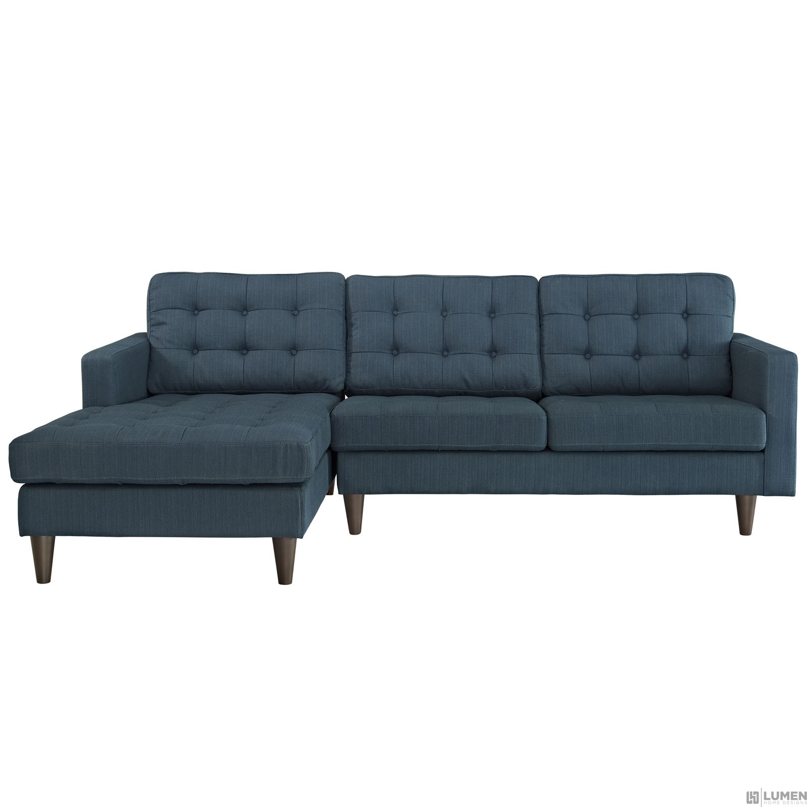 Short Description Modern left-side chair and loveseat Deeply tufted buttons Fine polyester upholstery Plastic foot glides Solid rubberwood legs Spot clean only Some assembly required