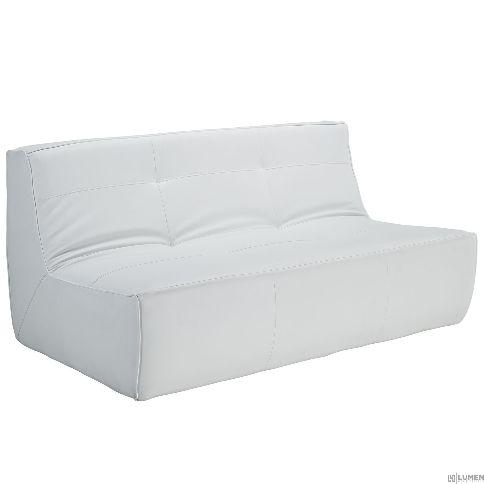 Short Description Modern sectional loveseat Bonded leather Foam padded cushions Slight trim and button tufting Wipe clean with damp cloth Solid wooden legs Black plastic foot glides