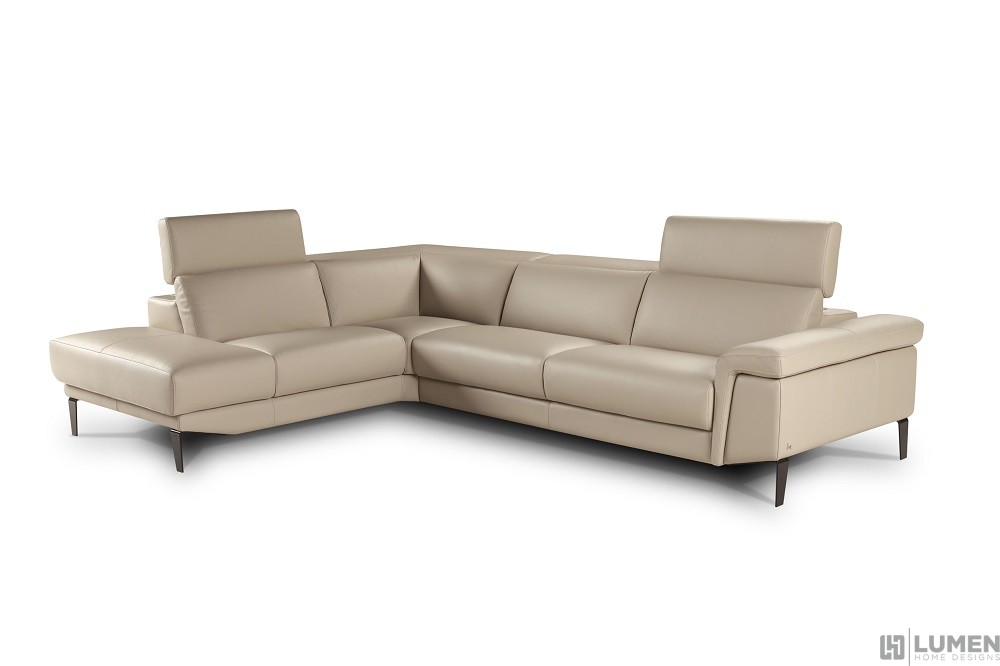 Short Description The classic lines of this simple chaise help it easily fit into any design scheme. Built for versatility, it features supple beige leather upholstery, premium memory foam padding and fully adjustable headrests. Plus, each headrest can be lowered independently to best fit your family's needs. This Italian design can comfortably sit up to 5 people. Our understated sectional will look right at home in any living room, family room or entertainment space. Its dimensions make it suitable for any size room. Choose your side: it's available in both right or left facing chaise configuration. Essentials about this piece: • Expertly finished in authentic Italian leather and stainless steel. • Left or right facing layout. • Adjustable headrests. • High elastic springs. • High density foam. • Some assembly required. • Color scheme: Beige. • Dimensions: 28.7" H x 132" L x 42.5" D. • Other furniture sold separately.