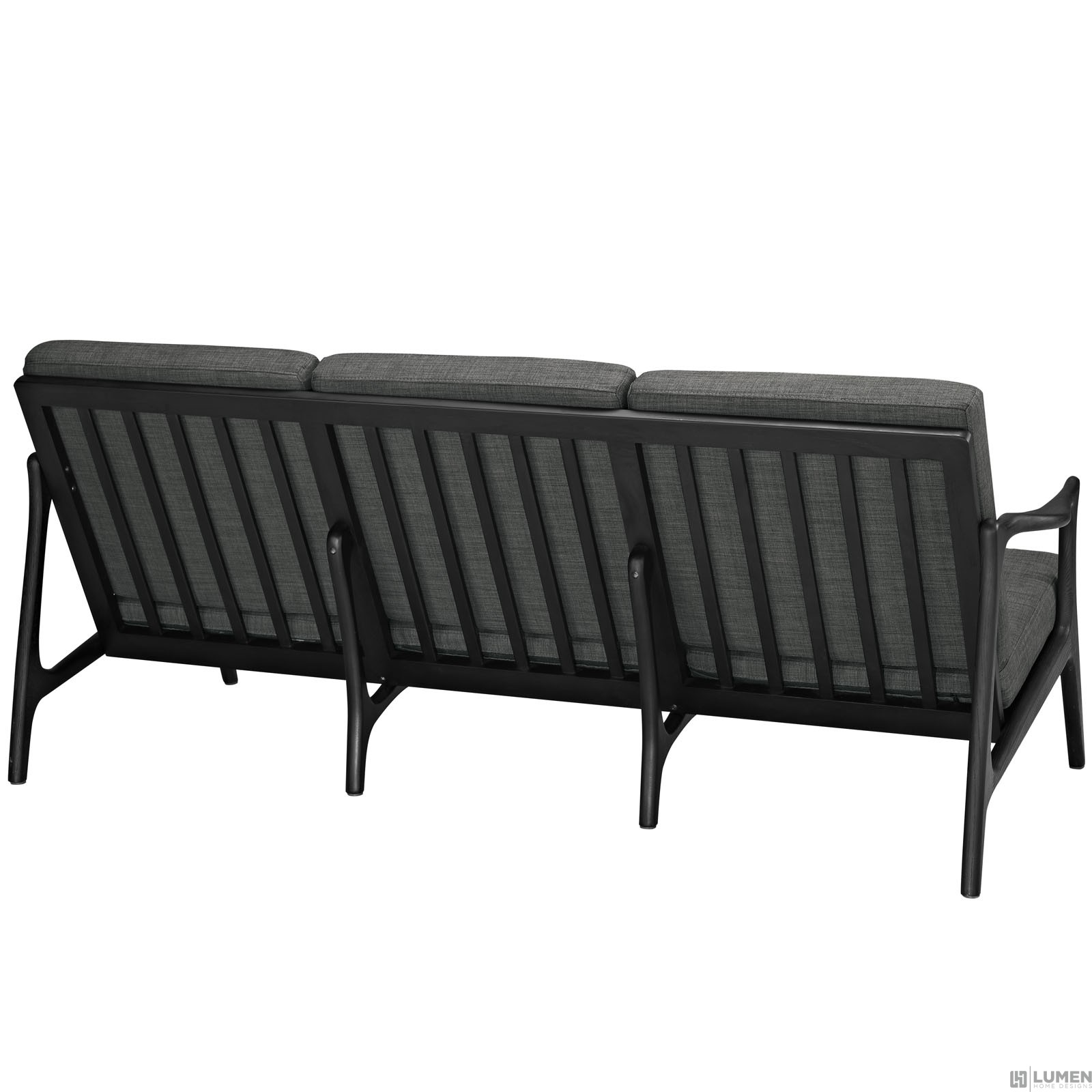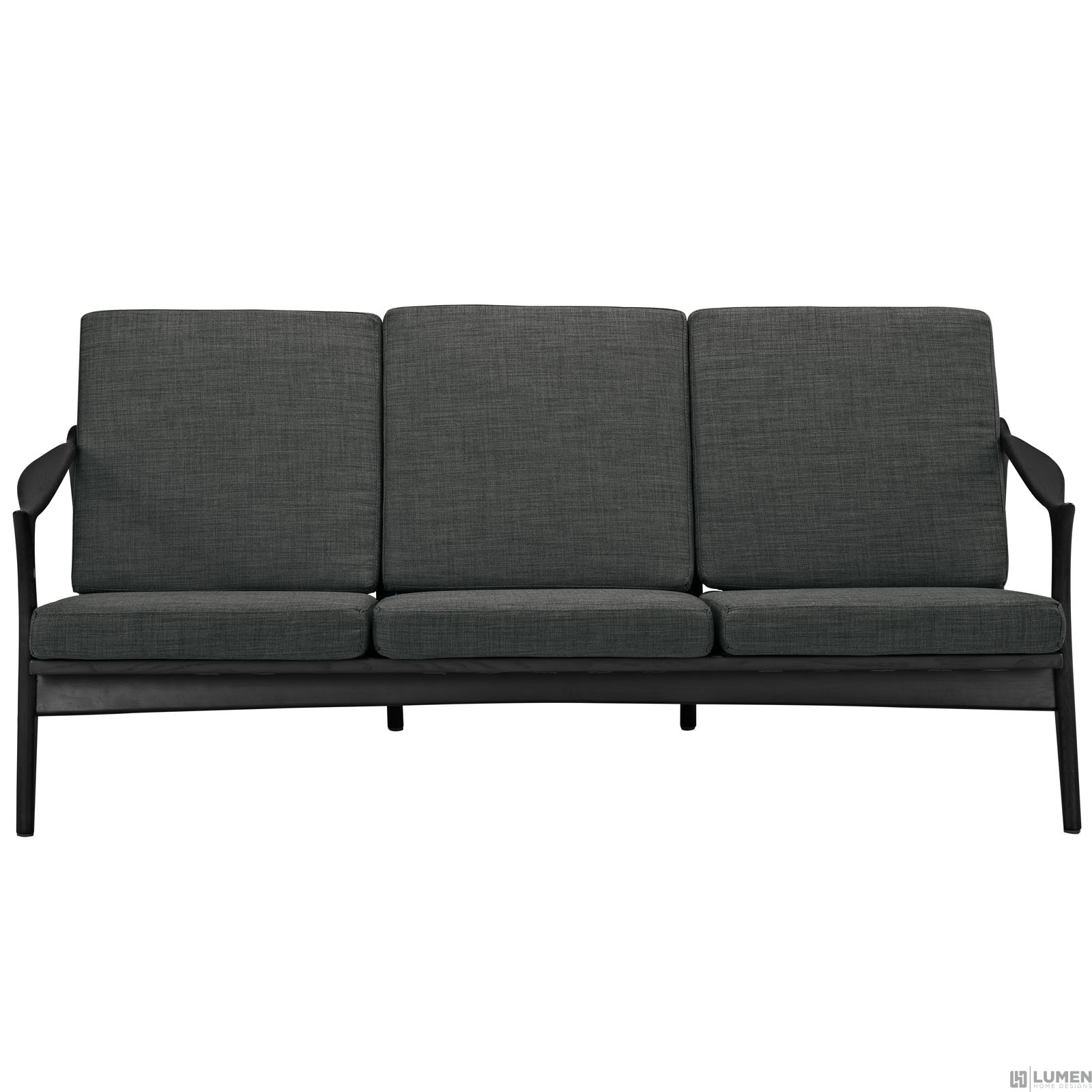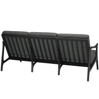Mid-century style sofa Solid ash wood construction Finely upholstered polyester Cushions fully removable "Spot clean fabric, wipe clean wood" No assembled required