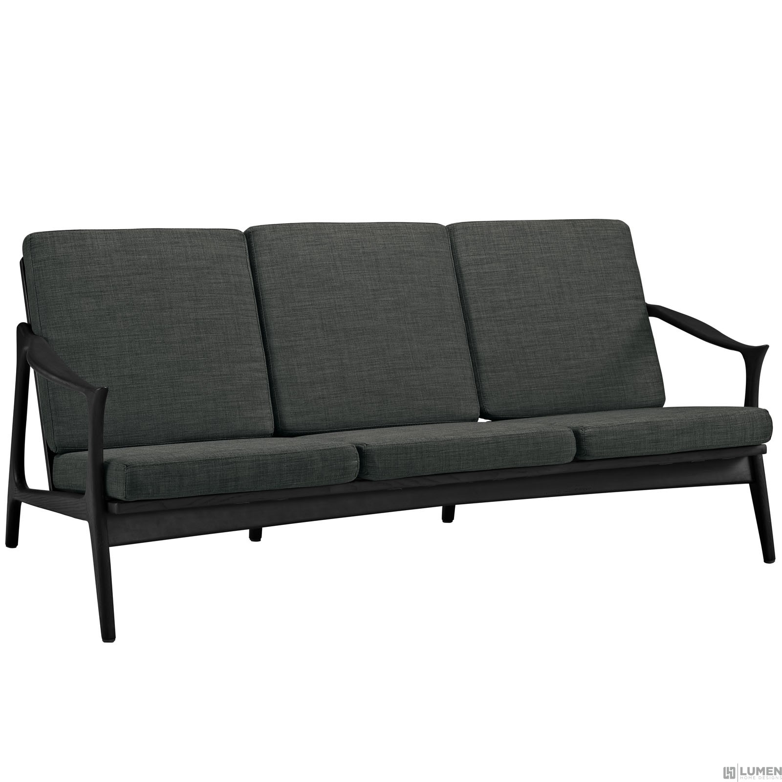 Short Description Mid-century style sofa Solid ash wood construction Finely upholstered polyester Cushions fully removable "Spot clean fabric, wipe clean wood" No assembled required