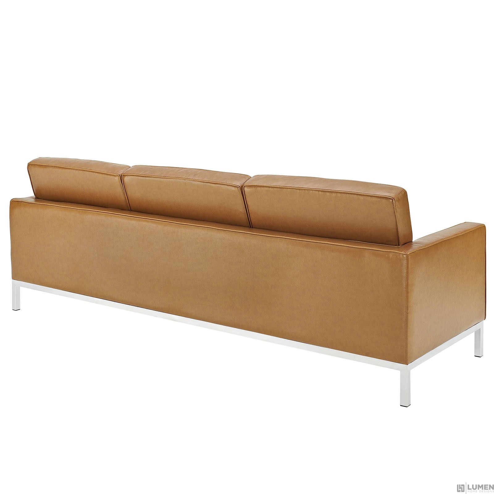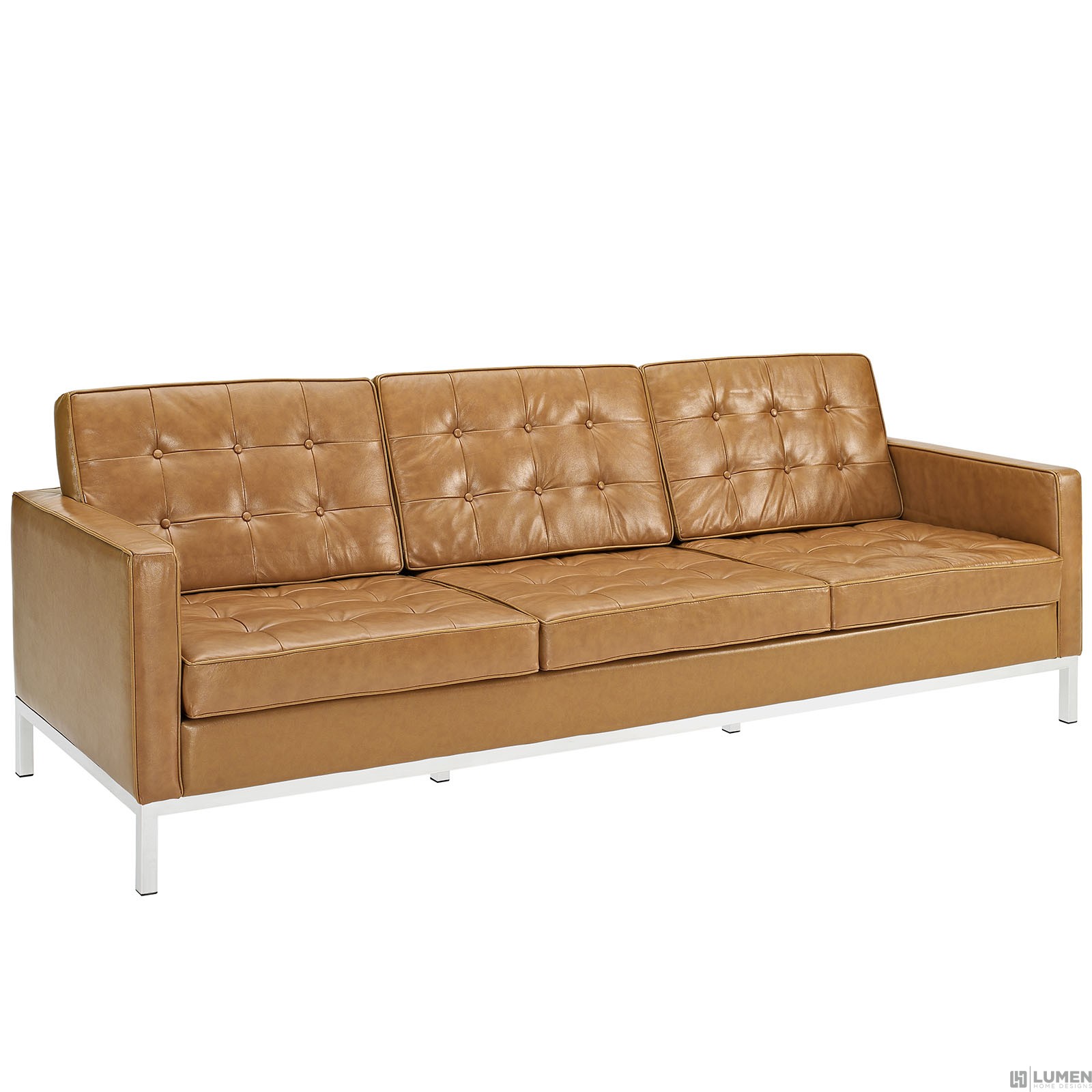 Mid-Century Modern Sofa Genuine Leather Seating Surfaces Tufted Seat and Back with Buttons Tubular Stainless Steel Frame Foot caps to prevent scratching