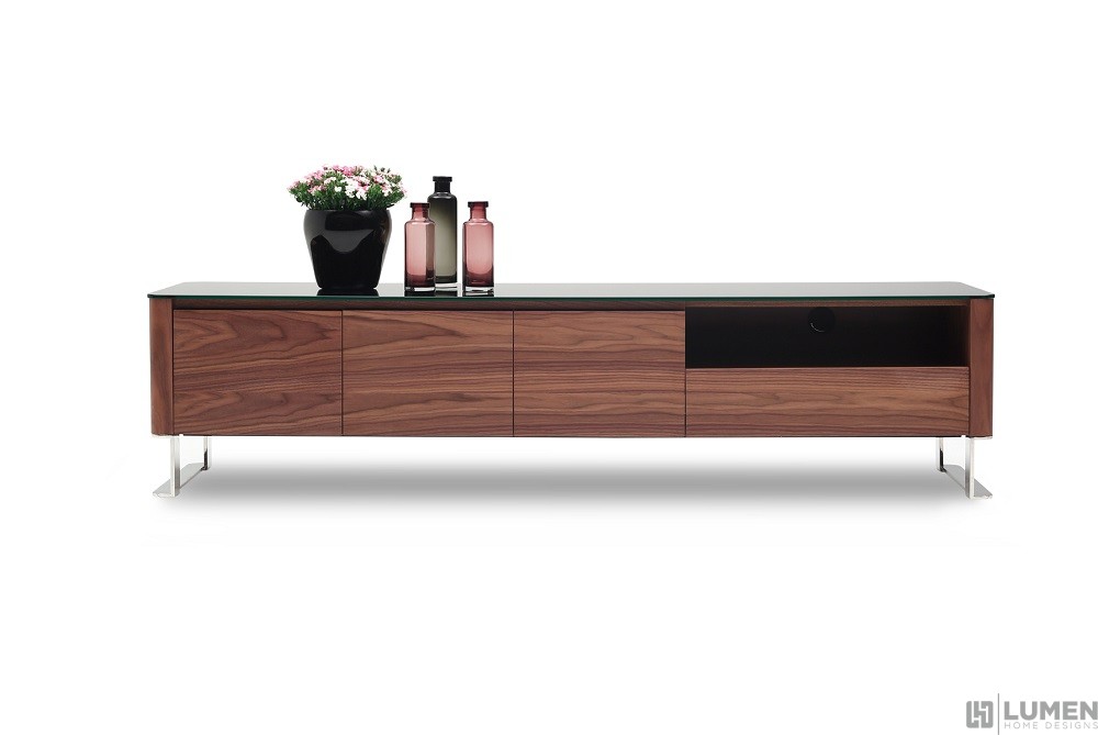 Short Description Finished in a warm walnut brown color, this retro inspired TV base will add an inviting touch to any media space. A sleek black lacquer table top gives it a modern edge. Coming in at almost 80 inches wide, it features ample space for flat screen TVs of all sizes. If you’re looking for extra storage options, this console also offers four deep drawers and an opening with precut holes for easy cable management. Discreet chrome plated stainless steel legs finish off this piece. Our casually sophisticated TV stand can be combined with other entertainment modules to best fit your living room, media room, home office or workspace. Essentials about this piece: • Expertly finished in solid walnut wood veneer and high gloss lacquer. • Deep drawers with premium soft closing tracks. • Stainless steel legs. • Assembly not required. • Color scheme: Walnut brown, black, high gloss. • Dimensions TV base: 78.7” W x 17.7” D x 18.9” H. • Dimensions media shelf: 26.3” W x 15.87” D x 5.98” H.