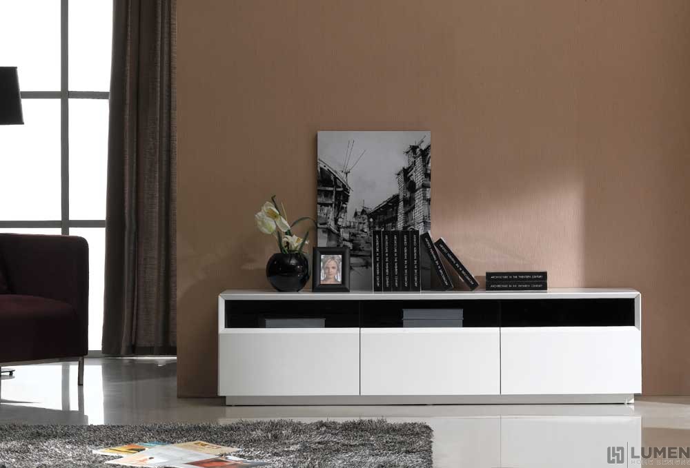 Short Description Featuring clean lines in crisp white, this TV console has been elegantly finished in high gloss lacquer. But have no fear of white: it can be easily wiped clean using a soft cloth and your preferred household cleanser. This console is both high in style and function, with ample open shelf space plus three deep drawers, to either display or discreetly hide away your entertainment devices, magazines and cables. Flat screen TVs large and small will easily fit atop this nearly 71-inch-wide table top. This modern TV stand can be combined with other contemporary media modules to best fit your living room, media room, home office or workspace. Essentials about this piece: • Expertly finished in high gloss lacquer. • Deep drawers with premium soft closing tracks. • Assembly not required. • Color scheme: White, high gloss. • Dimensions TV base: 70.78” W x 16.73” D x 18.7” H. • Dimensions opening: 22.5” W x 14” D x 7” H.