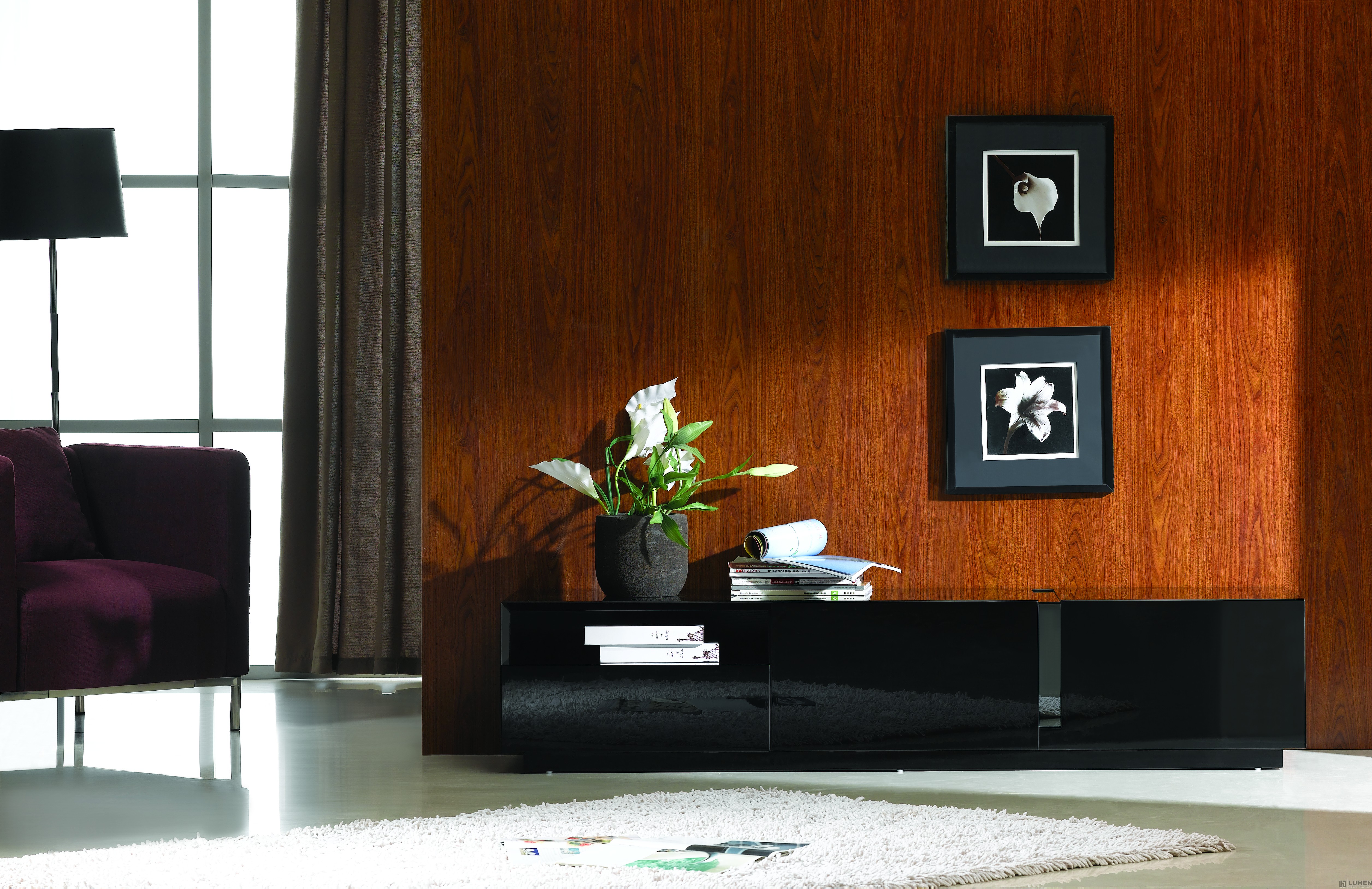 This minimalist TV base pairs a sleek glossy body with a split lacquer accent detail, that guides the eye between spaces. If you need extra storage, a discreet open shelf can house further media consoles and ample drawers below will fit anything else you want to hide away from sight like remotes and magazines. Coming in at almost 71 inches wide and 19 inches in diameter, this media base can easily accommodate flat screen TVs in a variety of sizes. This modern console can be combined with other entertainment modules to best fit your living room, media room, home office or workspace. Essentials about this piece: • Expertly finished in high gloss lacquer. • Deep drawers with premium soft closing tracks. • Assembly not required. • Color scheme: Black, high gloss. • Dimensions TV base: 70.86” W x 18.89” D x 14.96” H. • Dimensions opening: 22” W x 17” D x 4.5” H.