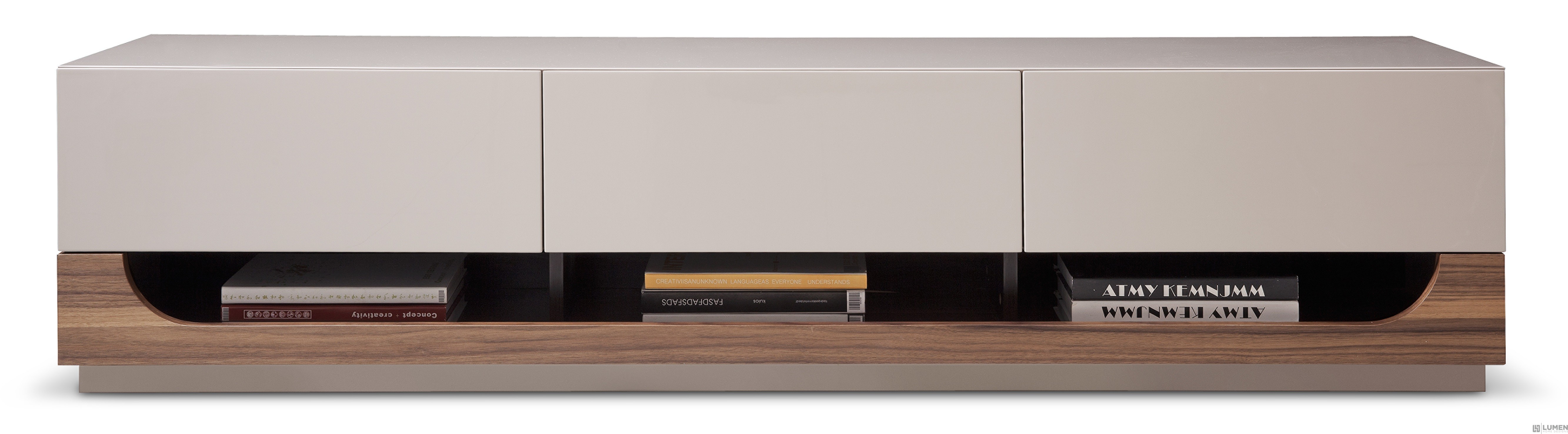Form, function and versatility all come together in this modular TV base. Not only stylish, this console is rich in storage options, featuring three roomy drawers, asymmetrical open shelving and an ample 71-inch table top. Warm finishes in solid wood veneers and neutral taupe gloss finish off this piece, meant for soft and modern color schemes. This classic entertainment base can be combined with other modern media modules to best fit your living room, media room, home office or workspace. Essentials about this piece: • Expertly finished in glass, solid wood veneers and lacquer. • Deep drawers with premium soft closing tracks. • Assembly not required. • Color scheme: Brown, black, high gloss. • Dimensions TV stand: 71" W x 16" D x 13.5" H. • Dimensions opening: 19" L x 15" D x 3.75" H.