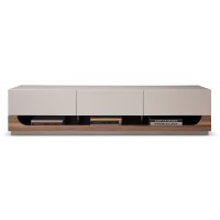 Short Description Form, function and versatility all come together in this modular TV base. Not only stylish, this console is rich in storage options, featuring three roomy drawers, asymmetrical open shelving and an ample 71-inch table top. Warm finishes in solid wood veneers and neutral taupe gloss finish off this piece, meant for soft and modern color schemes. This classic entertainment base can be combined with other modern media modules to best fit your living room, media room, home office or workspace. Essentials about this piece: • Expertly finished in glass, solid wood veneers and lacquer. • Deep drawers with premium soft closing tracks. • Assembly not required. • Color scheme: Brown, black, high gloss. • Dimensions TV stand: 71" W x 16" D x 13.5" H. • Dimensions opening: 19" L x 15" D x 3.75" H.