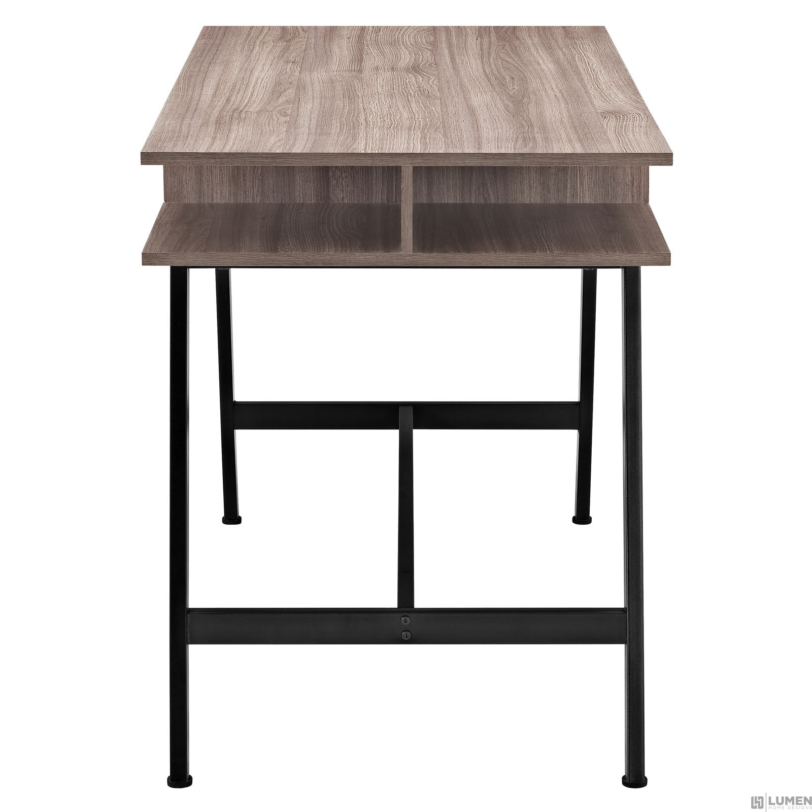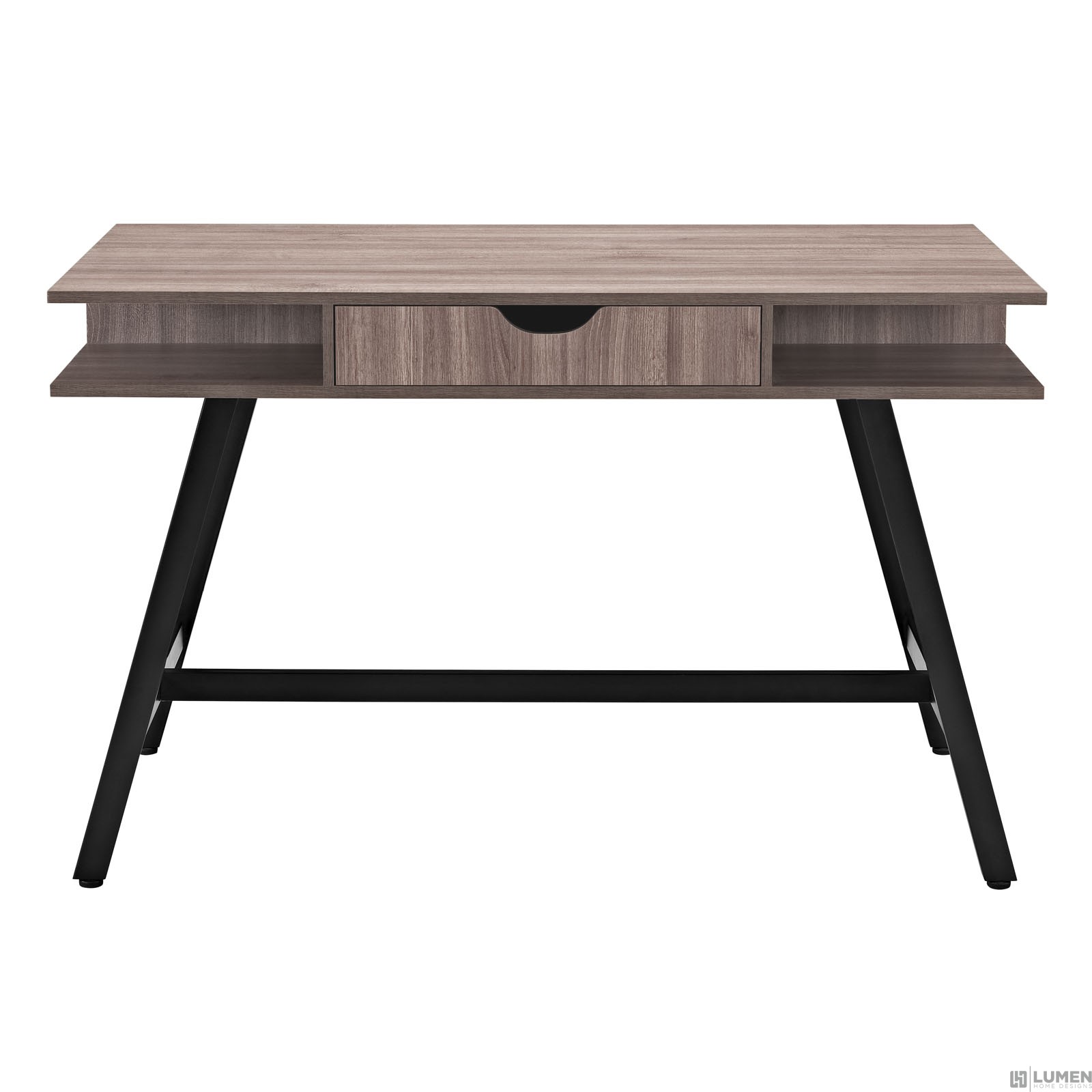Short Description Writing or computer work desk Powder-coated black steel legs Five cubby areas and drawer Natural wood-grained melamine Adjustable foot glides MDF construction Assembly Required
