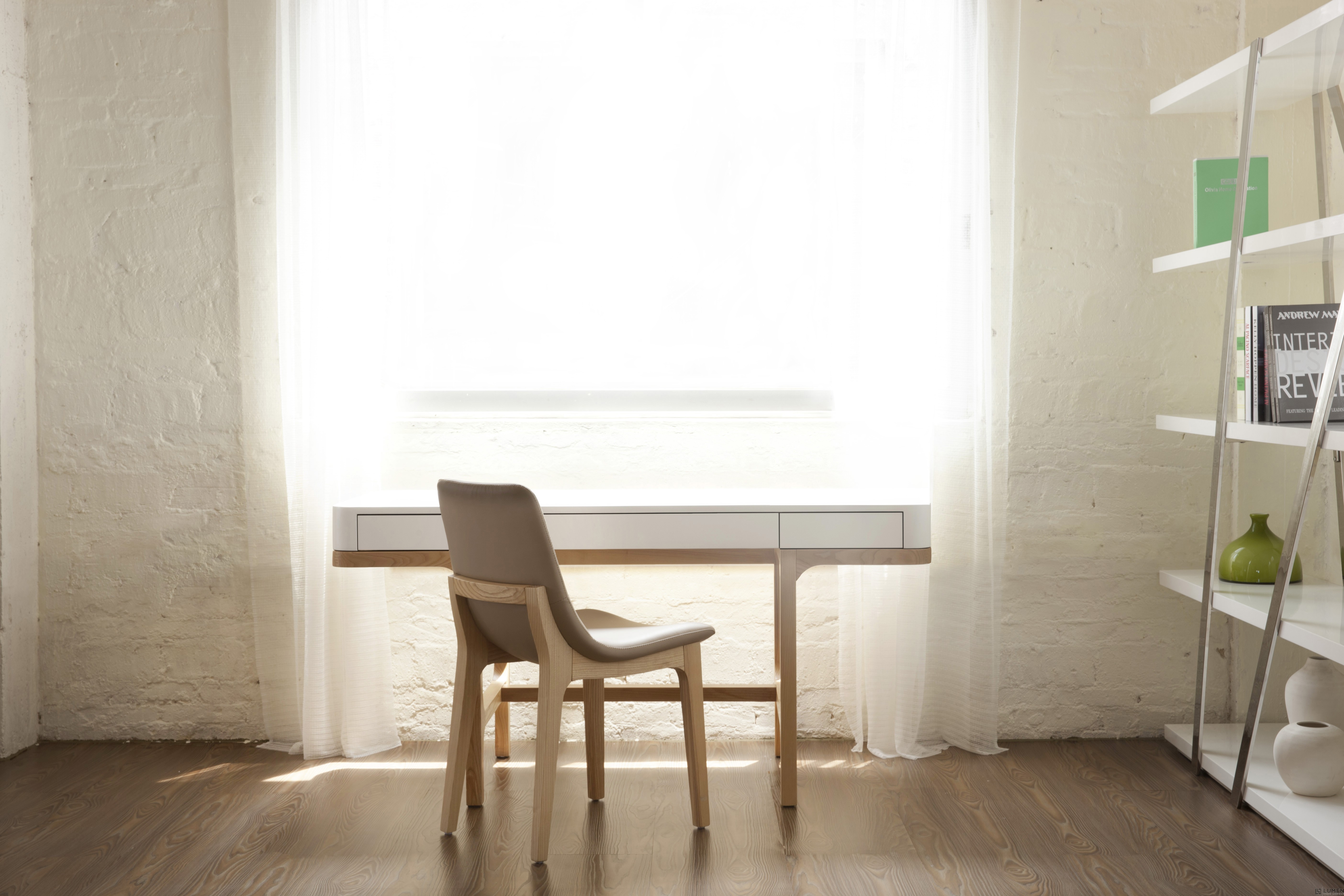 Short Description Taking inspiration from minimalist 1960s design, this lacquer and wood desk combines clean lines with contrasting materials for a contemporary look. If you need concealed storage, it features three subtle drawers to house documents and small office devices. With its spacious tabletop and uncluttered lines, this desk will put you right in the mood for business. This contemporary desk can stand alone or be paired with other pieces for added storage. Ideal for home or commercial offices. Essentials about this piece: • Expertly finished in solid wood veneers and matte lacquer. • Three drawers with premium soft closing tracks. • Some assembly required. • Color scheme: White, light brown, matte. • Dimensions: 59.1" W x 23.6" D x 29.5" H.
