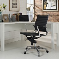 Modern Mid Back Office Chair Chrome-plated aluminum frame Ribbed vinyl cushioning Tension control knob and lock 360 Degree Swivel Five dual-wheeled casters Fully height adjustable