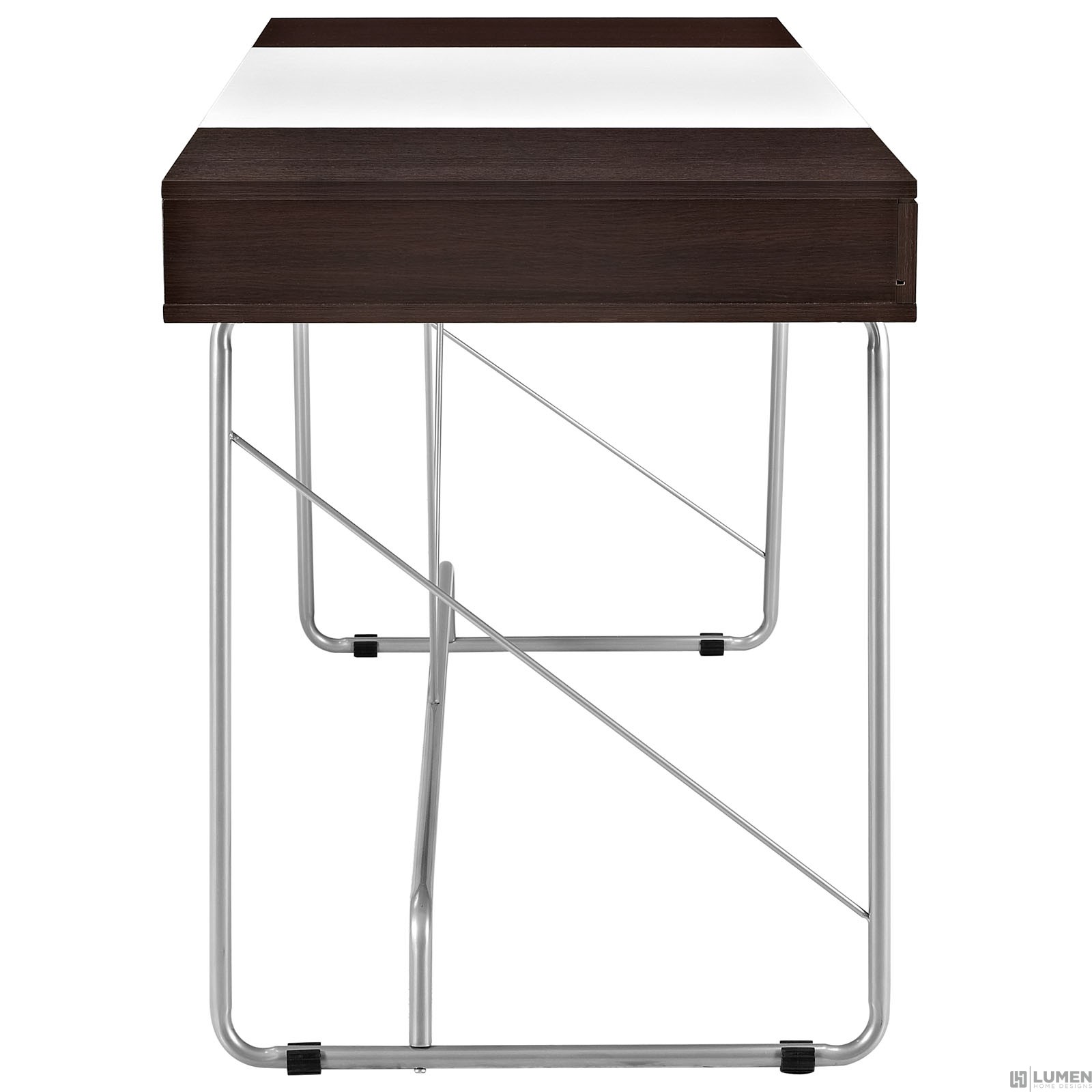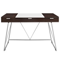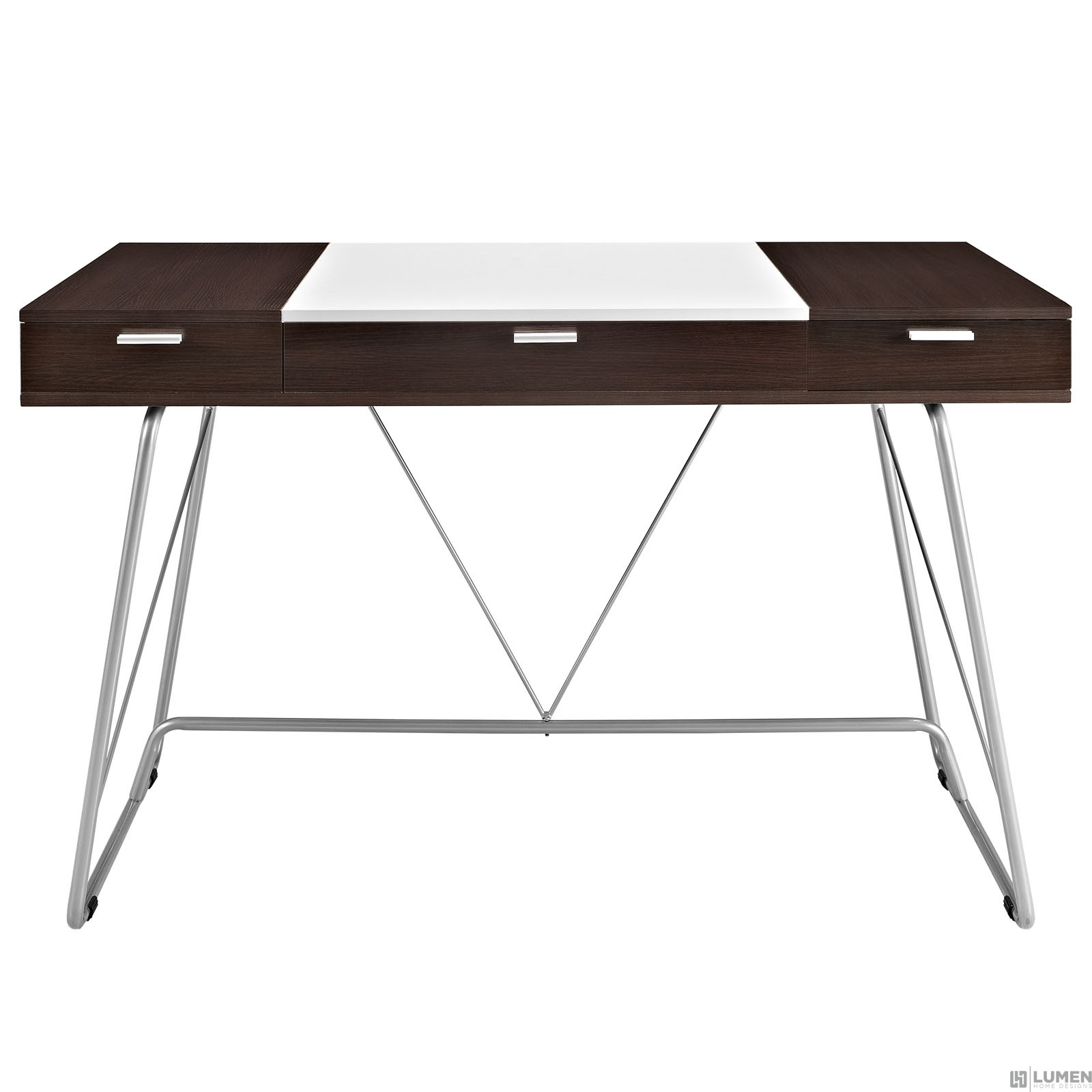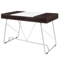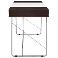 Short Description Contemporary dual-toned desk Three easy pull-out drawers MDF covered in melamine Wood-grain pattern Black plastic foot pads Metal tube base Assembly Required