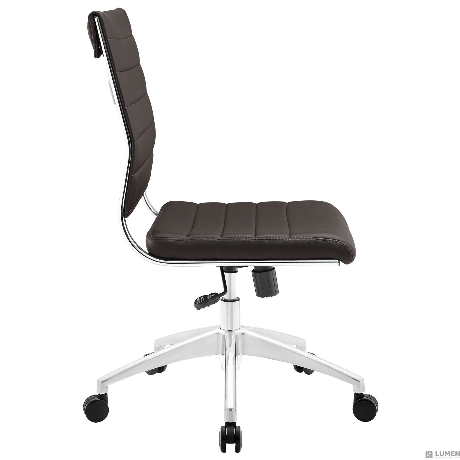Short Description Armless modern midback office chair Vinyl cushion rolls along back Chrome-plated aluminum frame Height adjustable Padded vinyl seat Back tilt lever and control knob Weight Capacity is 330 lbs. Assembly Required
