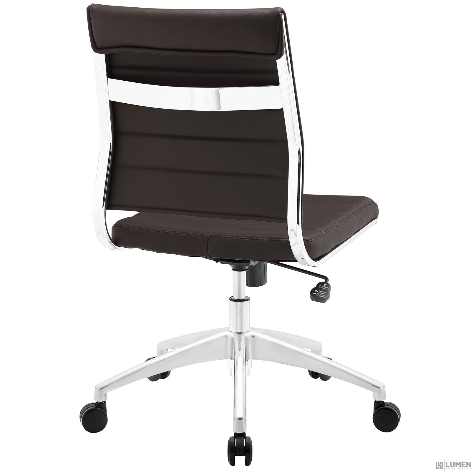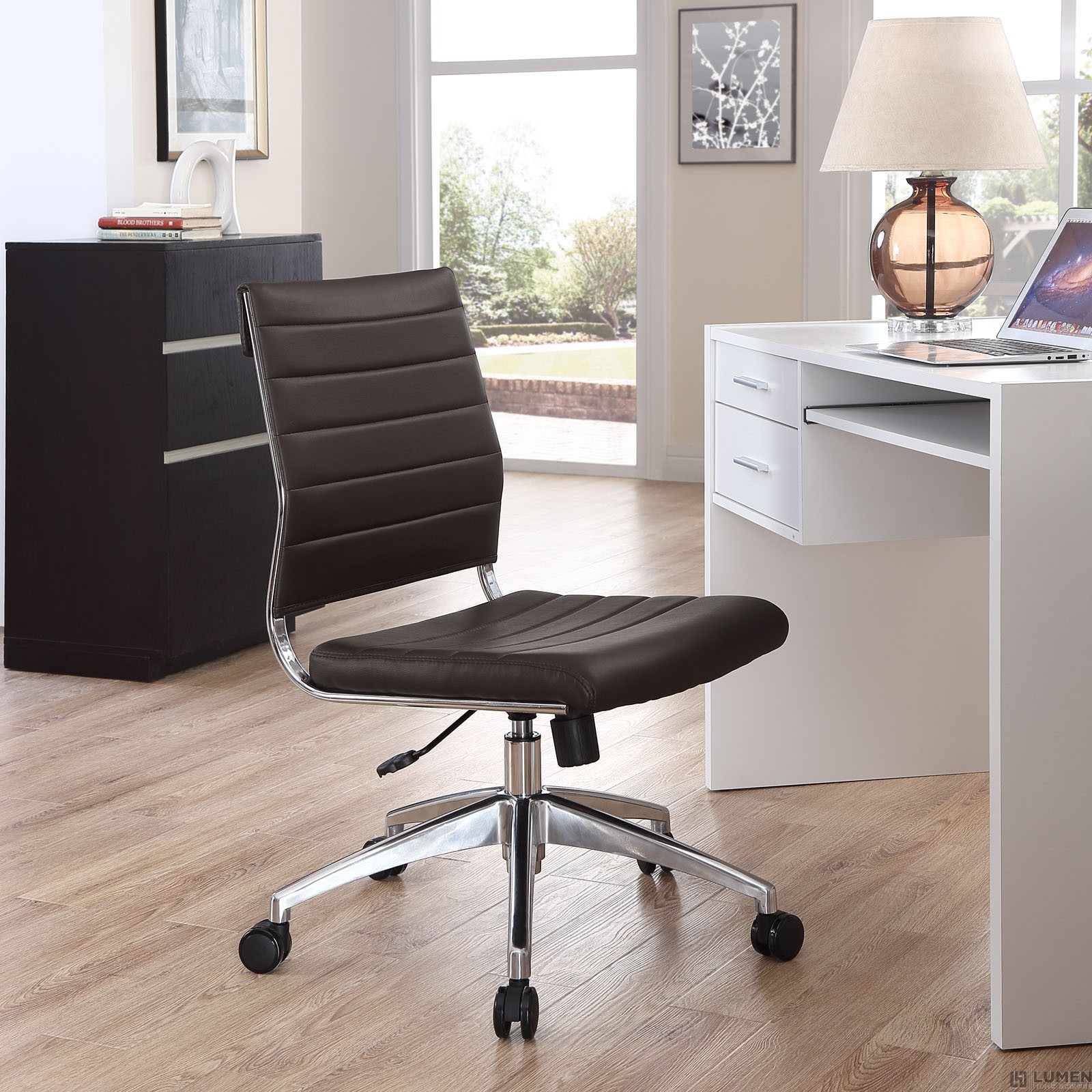 Armless modern midback office chair Vinyl cushion rolls along back Chrome-plated aluminum frame Height adjustable Padded vinyl seat Back tilt lever and control knob Weight Capacity is 330 lbs. Assembly Required