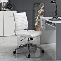Armless modern midback office chair Vinyl cushion rolls along back Chrome-plated aluminum frame Height adjustable Padded vinyl seat Back tilt lever and control knob Weight Capacity is 330 lbs. Assembly Required