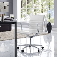 Short Description Mid-century modern office chair Padded vinyl ribbed back and seat Polished chrome aluminum base Five dual-wheel steel casters 360 degree swivel Wipe clean surface Assembly Required