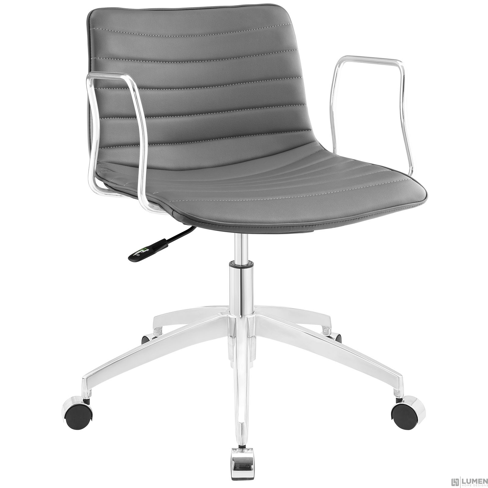 Mid-century modern office chair Padded vinyl ribbed back and seat Polished chrome aluminum base Five dual-wheel steel casters 360 degree swivel Pneumatic height adjustment Assembly Required