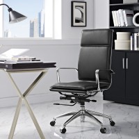Short Description Mid-century modern office chair Padded vinyl ribbed back and seat Polished chrome aluminum base Five dual-wheel steel casters 360 degree swivel Pneumatic height adjustment Assembly Required