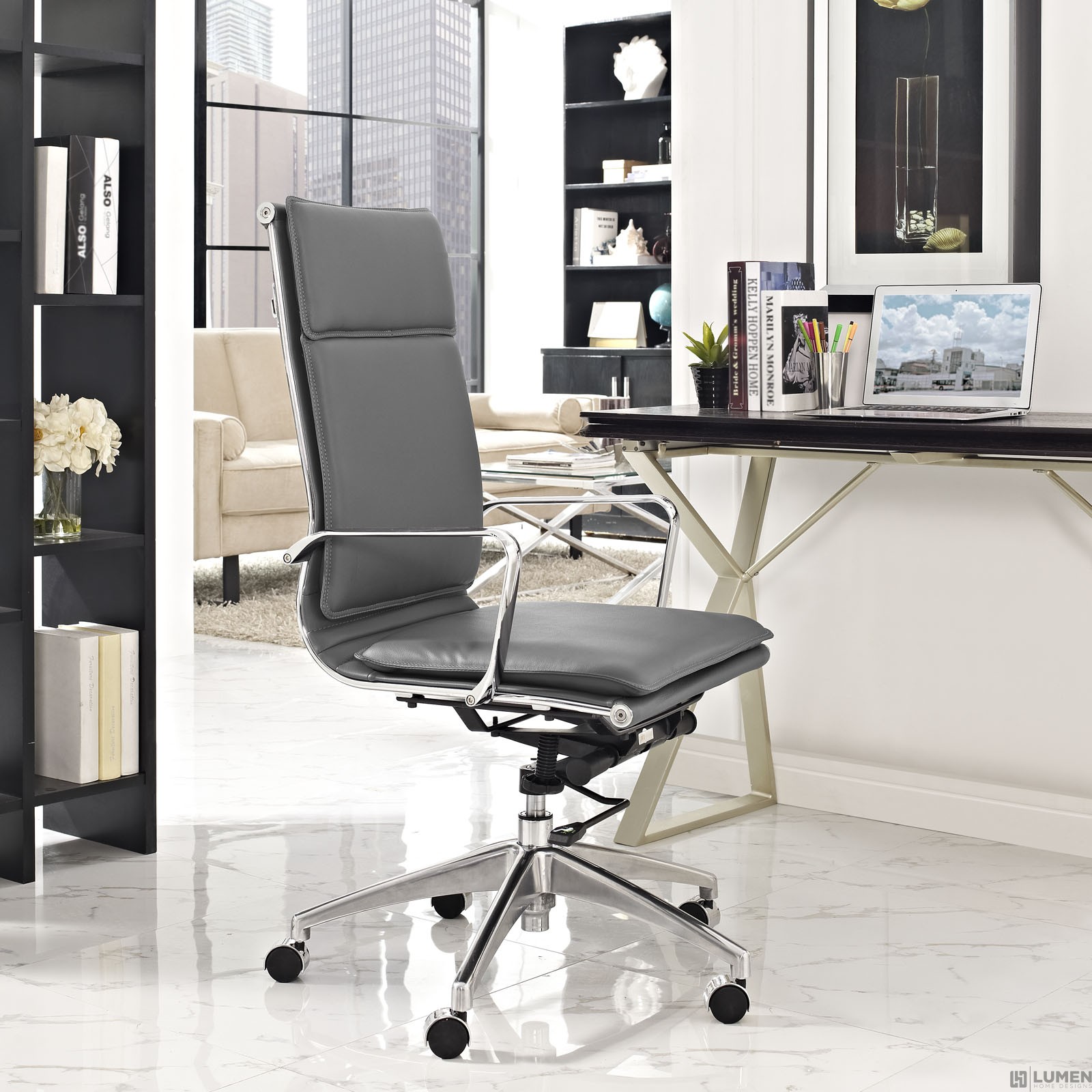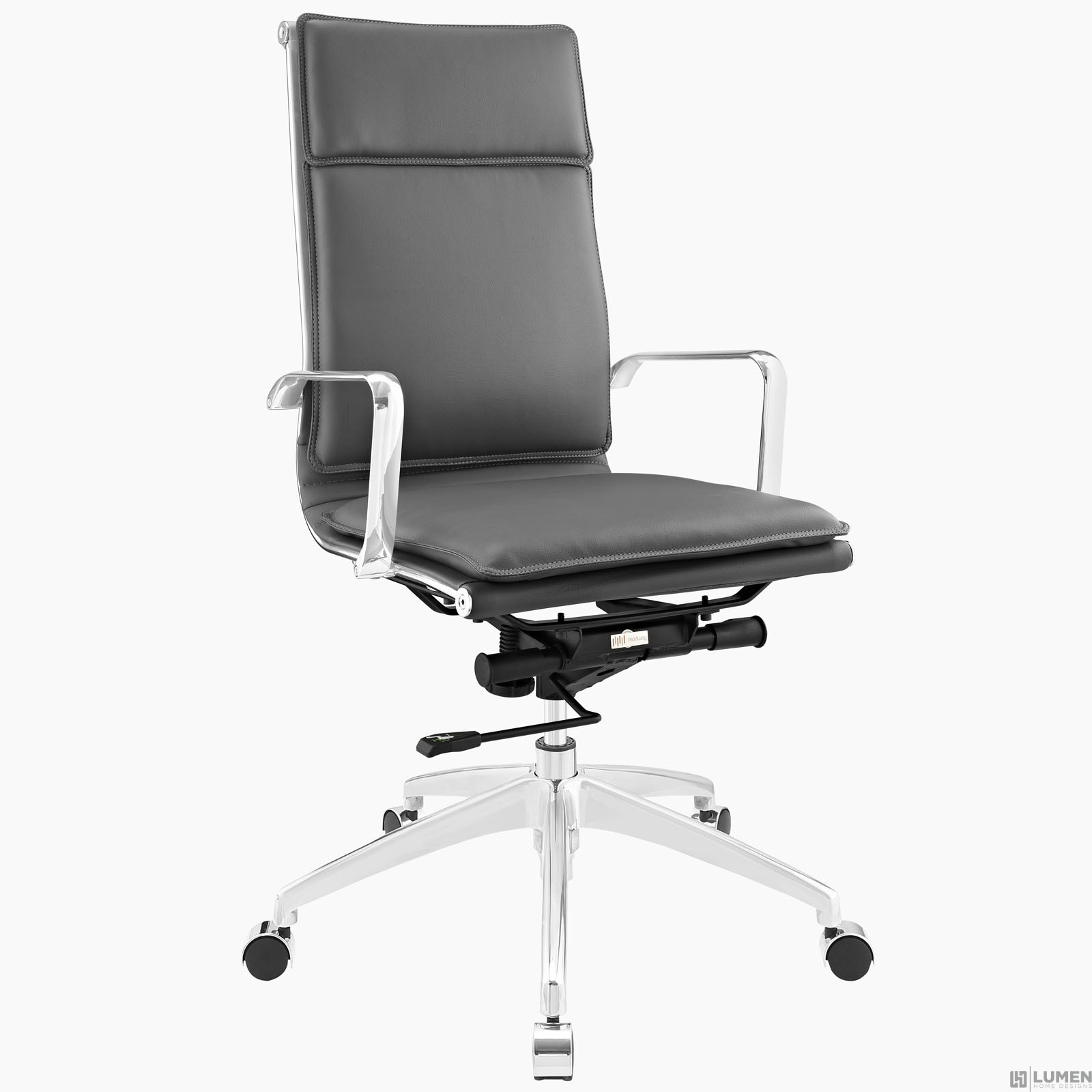 Short Description Mid-century modern office chair Padded vinyl ribbed back and seat Polished chrome aluminum base Five dual-wheel steel casters 360 degree swivel Pneumatic height adjustment Assembly Required
