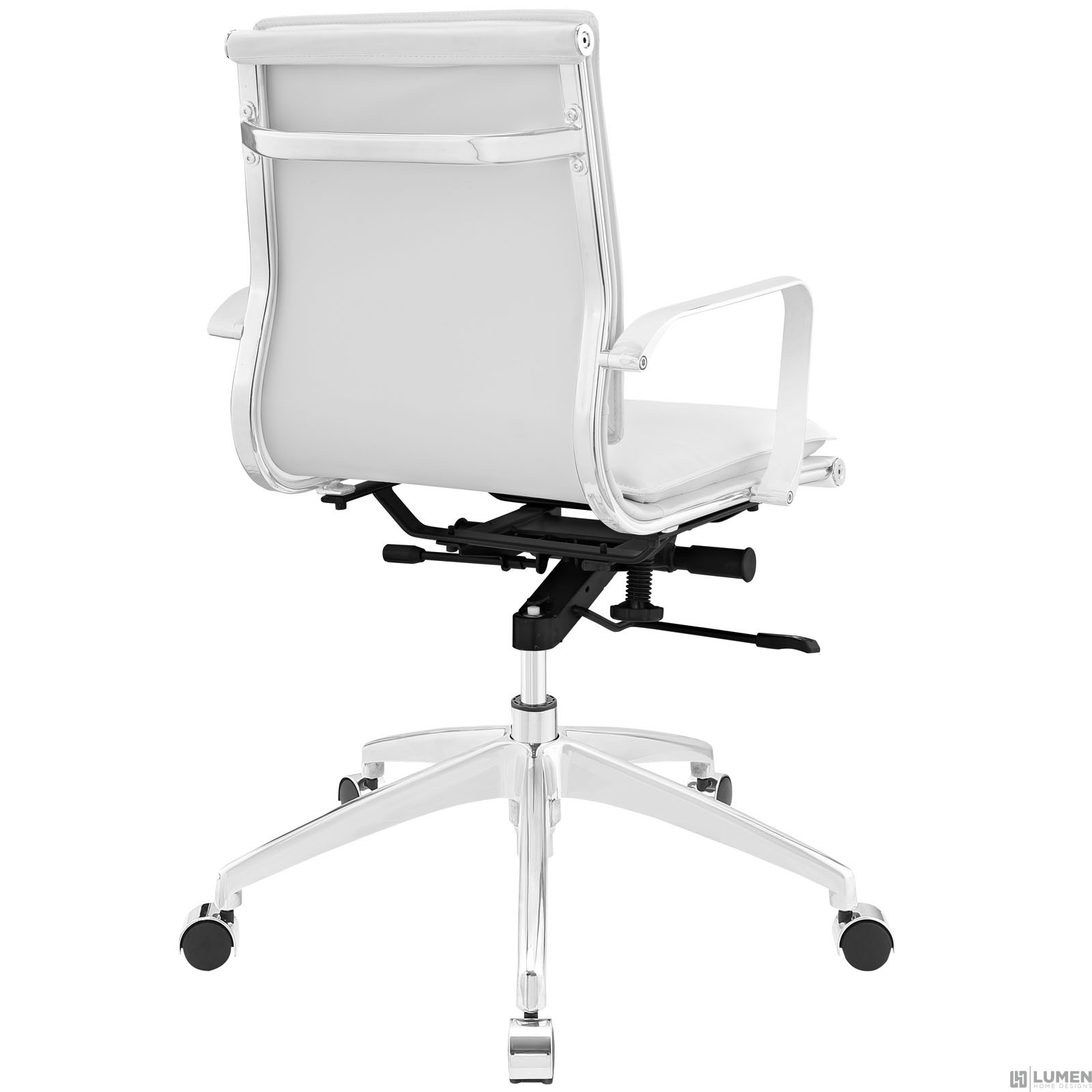 Mid-century modern office chair Padded vinyl ribbed back and seat Polished chrome aluminum base Five dual-wheel steel casters 360 degree swivel Pneumatic height adjustment Assembly Required