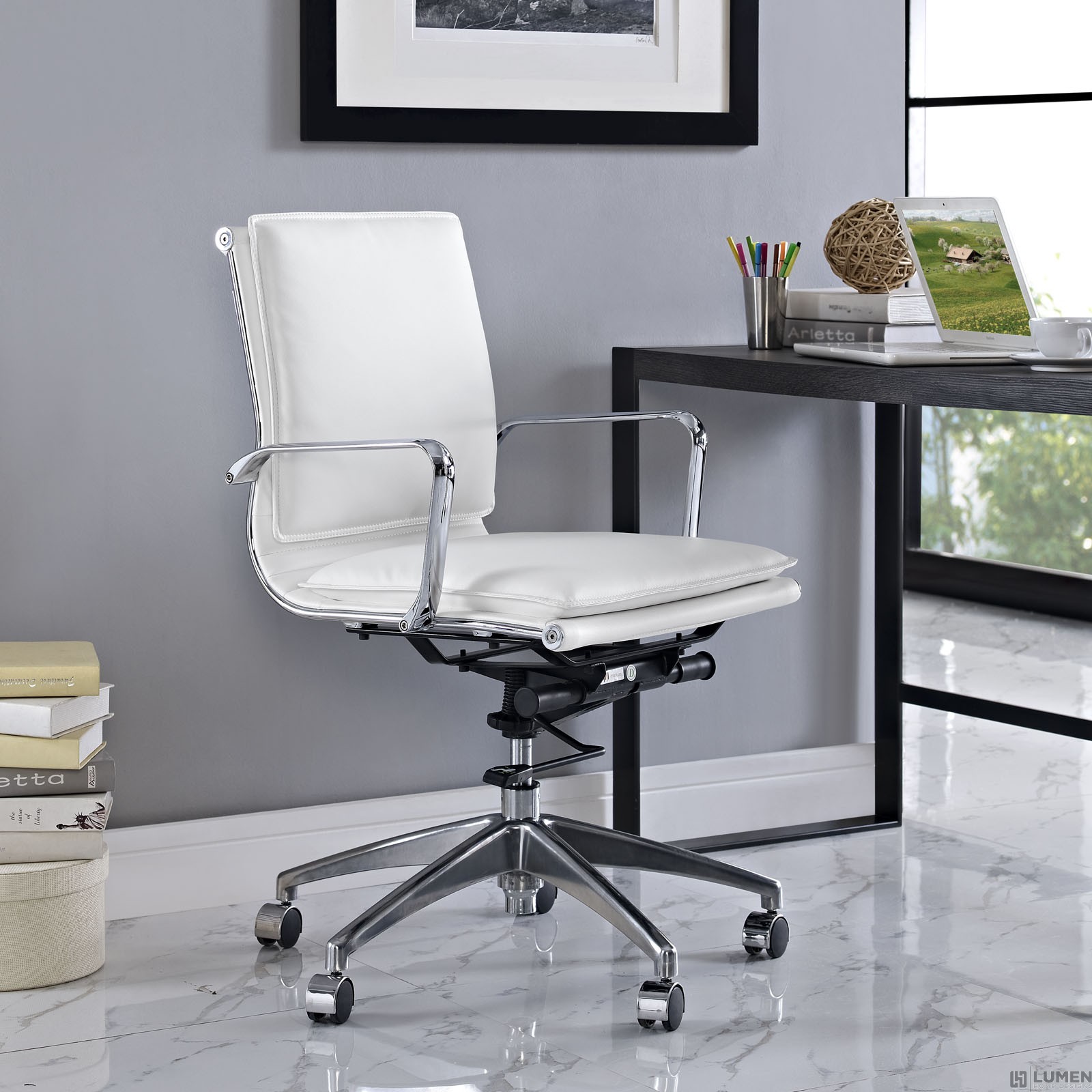 Short Description Mid-century modern office chair Padded vinyl ribbed back and seat Polished chrome aluminum base Five dual-wheel steel casters 360 degree swivel Pneumatic height adjustment Assembly Required