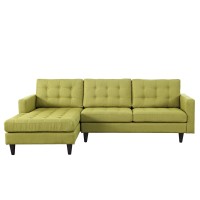 Modern left-side chair and loveseat Deeply tufted buttons Fine polyester upholstery Plastic foot glides Solid rubberwood legs Spot clean only Some assembly required