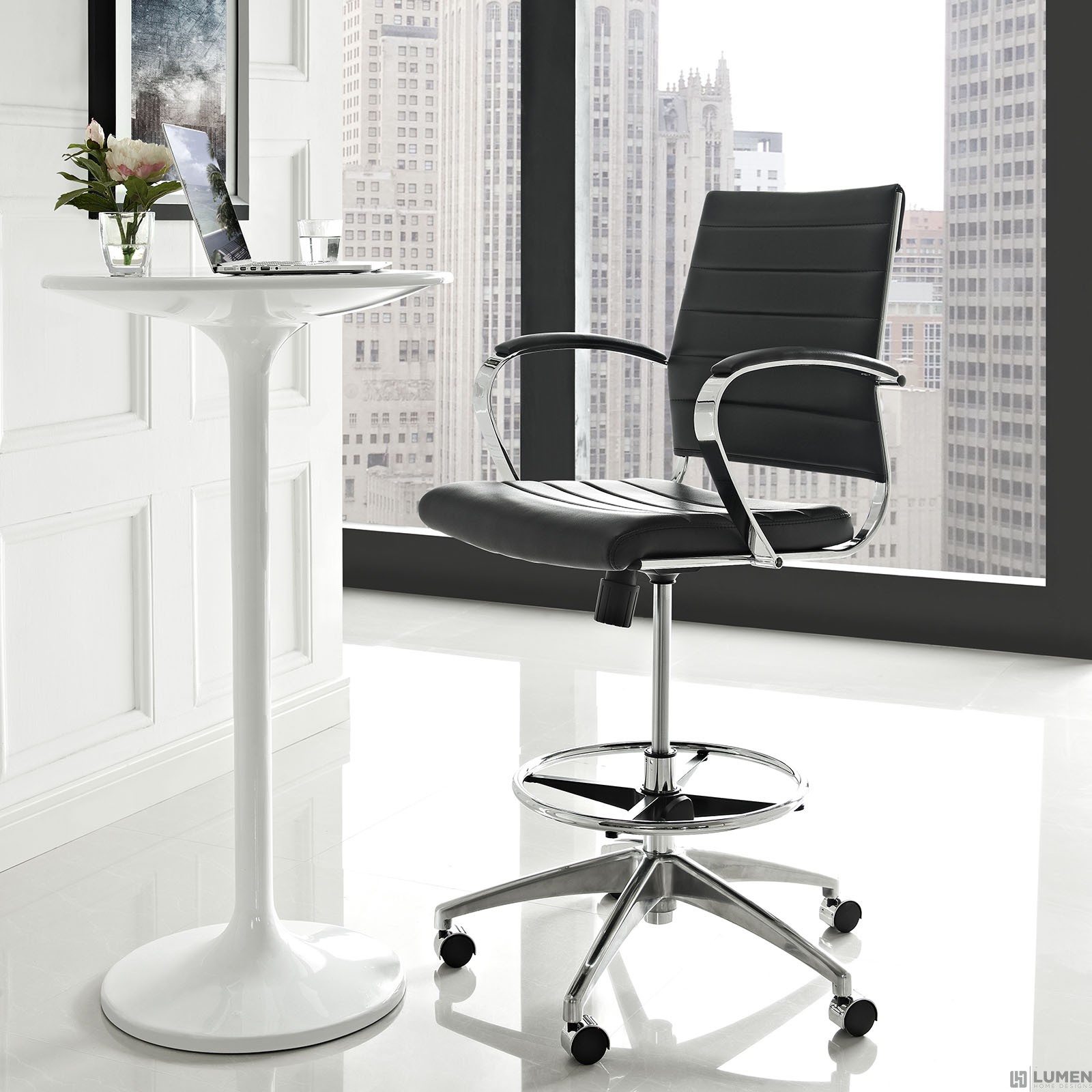 Short Description Modern Drafting Stool Padded Vinyl Cushions Chrome-plated Aluminum Frame Tall Pneumatic Gas Cylinder Sturdy Footring Height Adjustable Assembly Required