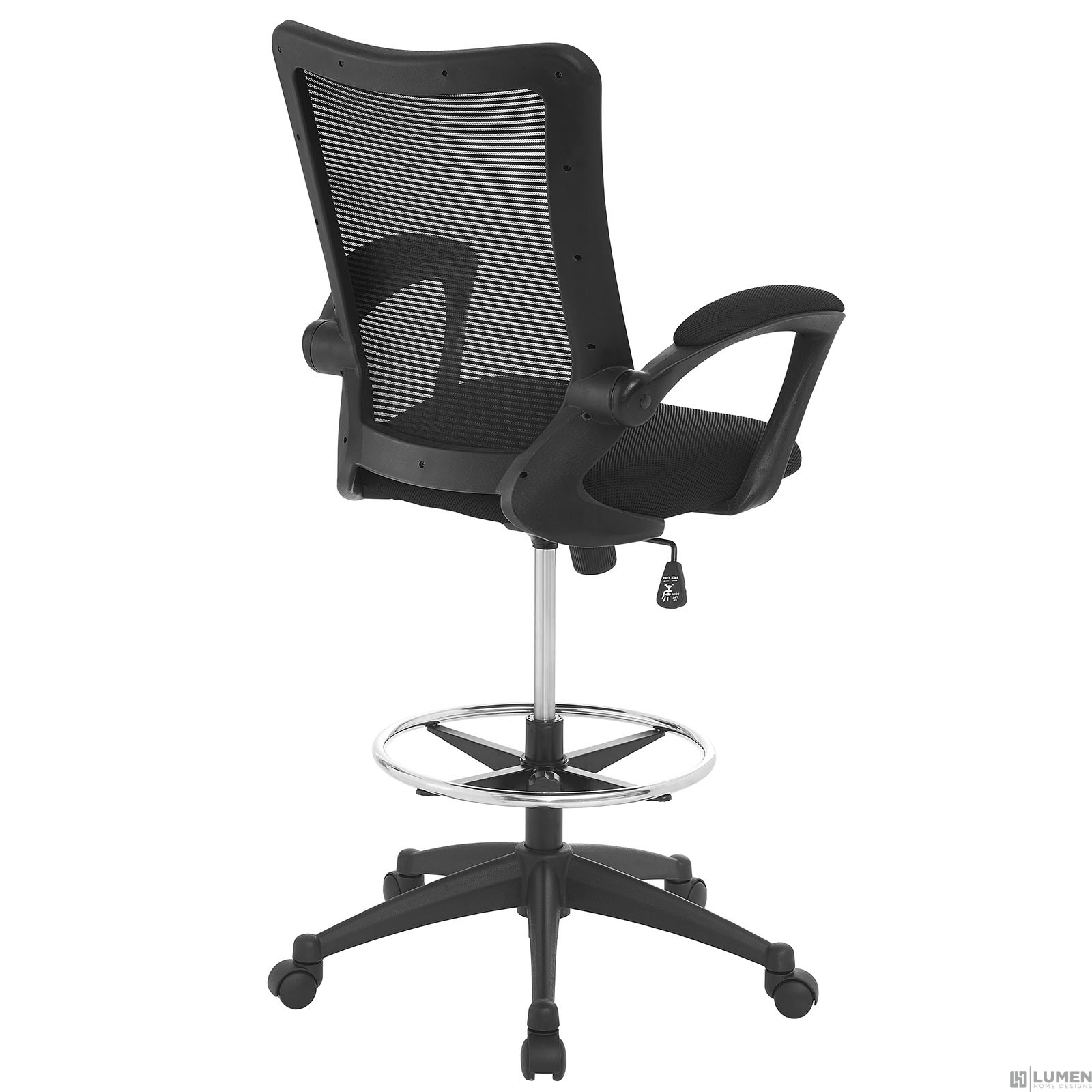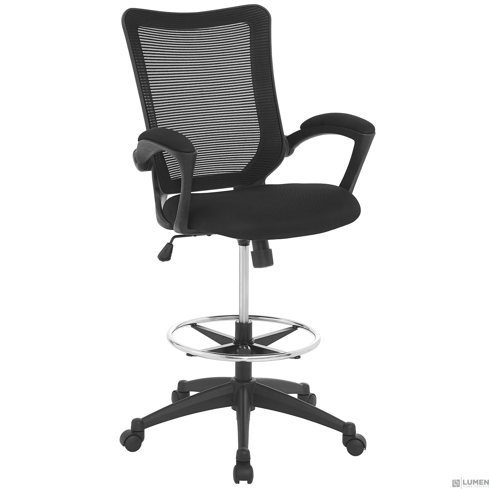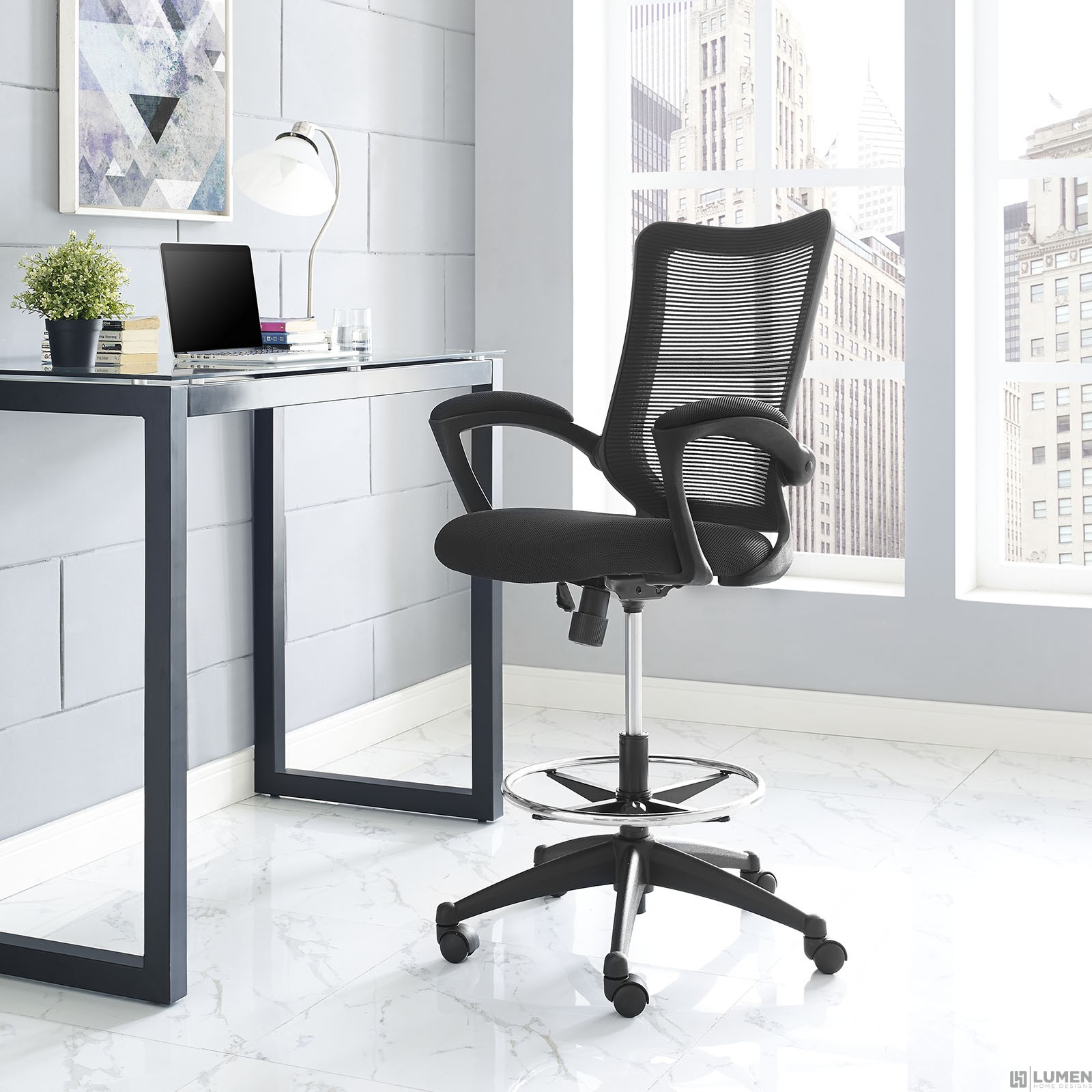 Short Description Modern Drafting Stool Sleek Mesh Padded Armrests Breathable Black Mesh Back Tall Pneumatic Gas Cylinder Sturdy Steel Footring Assembly Required Weight Capacity: 242 lbs