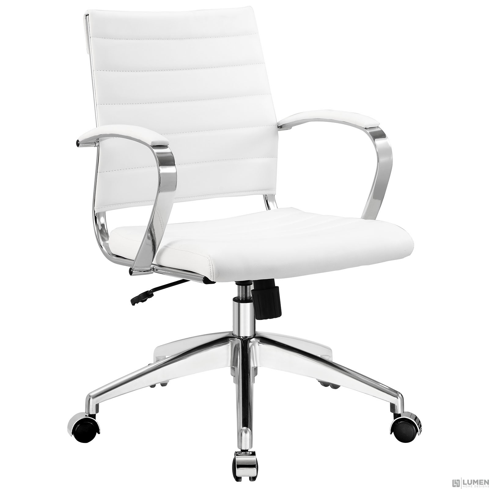 Mid back modern office chair Vinyl cushion rolls along back Chrome-plated aluminum frame Height adjustable Padded vinyl seat Back tilt lever Assembly Required