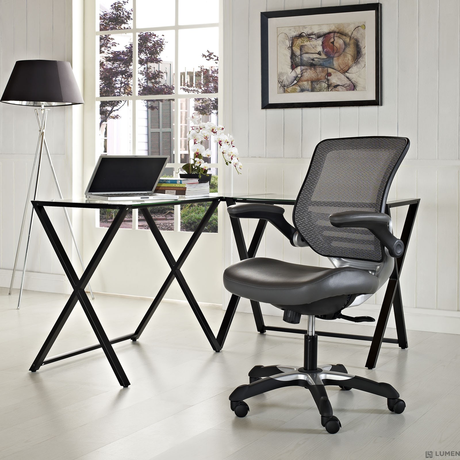 Short Description Mesh Back Sponge Seat Covered with Leatherette Cover Seat Tilt with Tension Control Adjustable Seat Height Flip-Up Arms BIFMA Tested and Approved Assembly Required