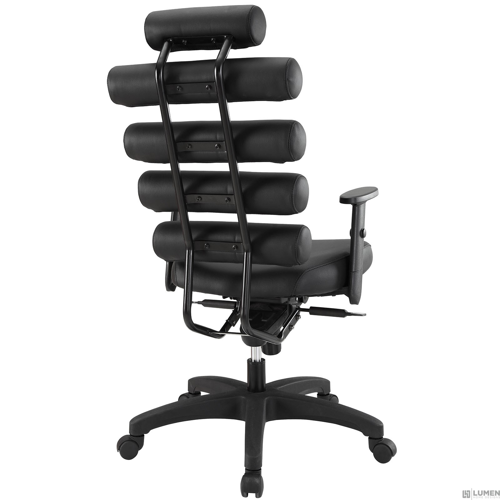 Faux Leather cushion rolls along back Powder Coated Steel Frame Padded height adjustable arms Height adjustable chair Padded Faux leather seat Back tilt lever Assembly Required