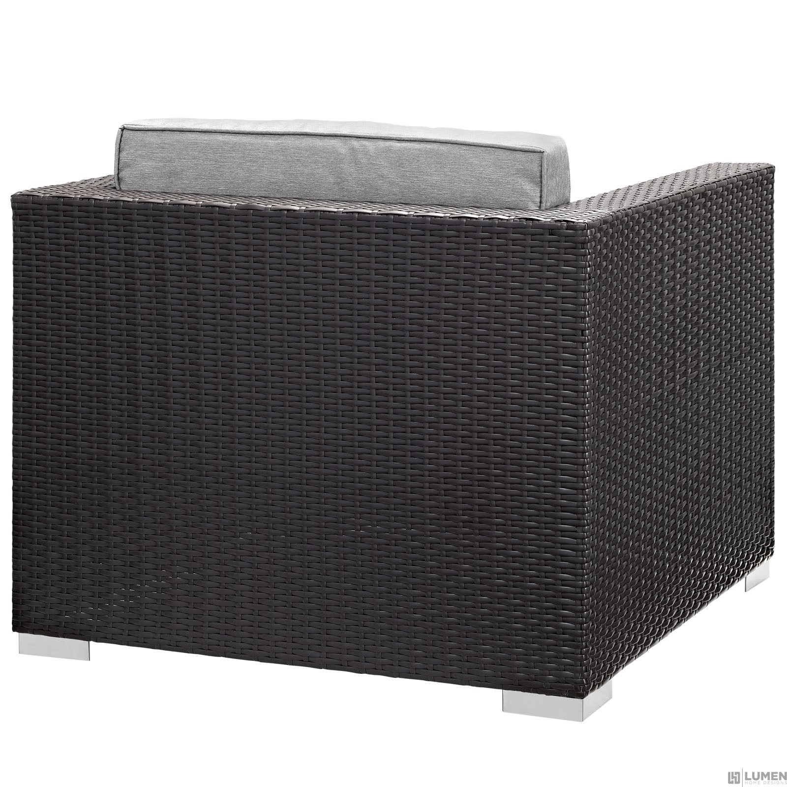 Short Description Outdoor Patio Armchair Synthetic Rattan Weave Powder Coated Aluminum Frame Water & UV Resistant Machine Washable Cushion Covers Ships Pre-Assembled